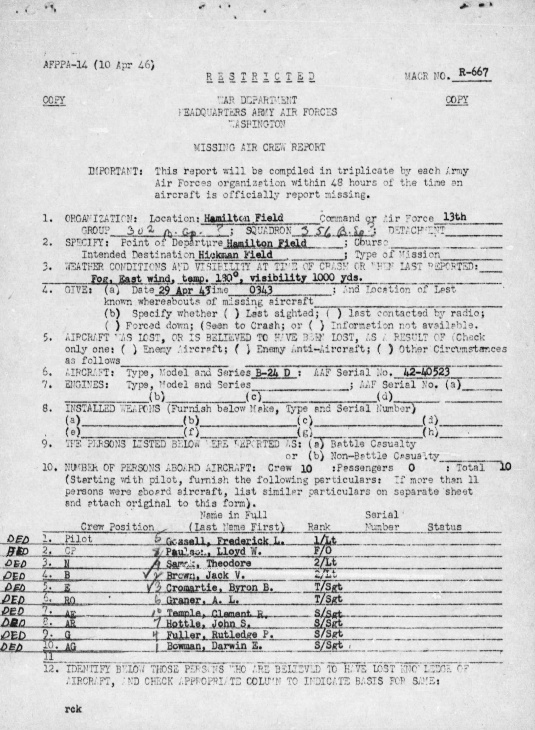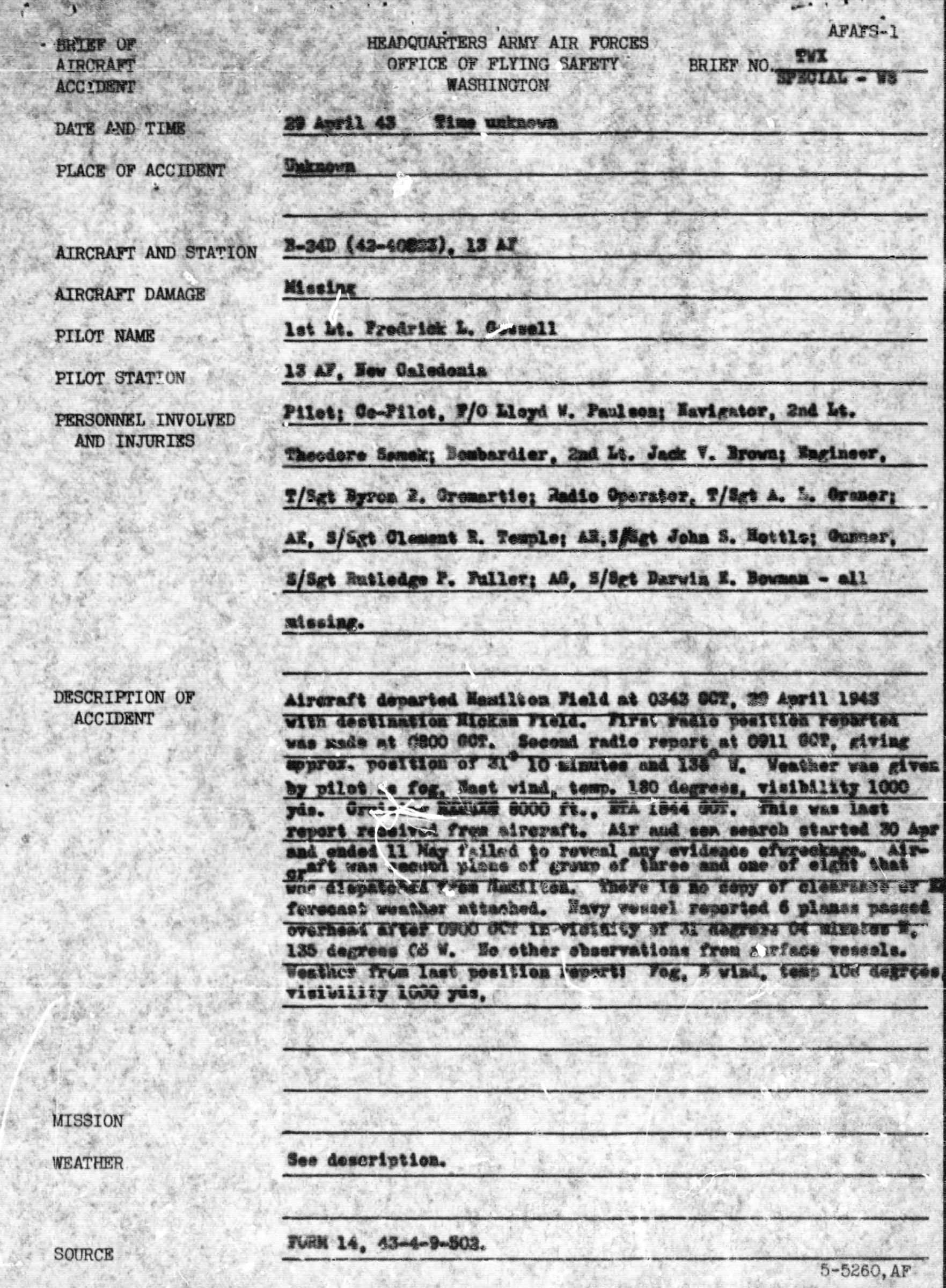 Aircraft B-24D with serial number 42-40523 departed from Hamilton Field at 0343, 29 April 1943 with destination Hickam Field. First radio position reported was made at 0800 GCT. Second radio report at 0911 GCT, giving approx. position of 31 10 degrees N and 135 W. Weather was given by pilot as fog. Fast wind, temp. 180 degrees, visibility 1000 yards. ETA 1844 GCT. This was the last report received from the aircraft. Air and sea search stated on 30 April and ended 11 May, failed to reveal any evidence of wreckage. The aircraft was the second plane of the group of three and one of eight that was dispatched from Hamilton. Navy vessel reported 6 planes passed overhead after 0900 GCT in the vicinity of 31 degrees 04 N, 135 degrees W.