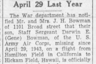 The War department has notified Mr. and Mrs. J.H. Bowman of 1101 Broad street that their son, Staff Sergeant Darwin E. (Gene) Bowman, of the U.S. Army Air Corps, missing since April 29, 943, on a flight from Hamilton Field in California to Hickam Field, Hawaii, is officially presumed to be dead. An extensive search has been conducted for the missing B-24 on which Staff Sergeant Bowman was the tail gunner, but no trace has been found either of the plane or members of the crew, the War department reported. Sergeant Bowman, who was 19 years of age at the time he was reported missing attended high school in Erwin, Tenn., where his family was located prior to moving to Bristol two years ago, and, entered the air corps July 22, 1942. He took his basic training at Atlantic City and received his wings at Fort Myer, Fla. He was transferred to Hamilton Field in California as tail gunner on a heavy bomber and it was this point that his plane took off on April 29 for Hickam Field in Hawaii. The bomber failed to reach its destination and on July 6 last year the War department notified Mr. and Mrs. Bowman that their son was missing. Mr. and Mrs. Bowman have two other sons in service. First Lieutenant Harold J. Bowman is with the airborne engineers in the South Pacific war theatre and Technical Sergeant Daniel W. Bowman is an instructor in aerial gunnery at Drew Field, Tampa, Fla. Since coming to Bristol, Mr. Bowman has been manager of the meat market at the Little Store in Pennsylvania avenue.