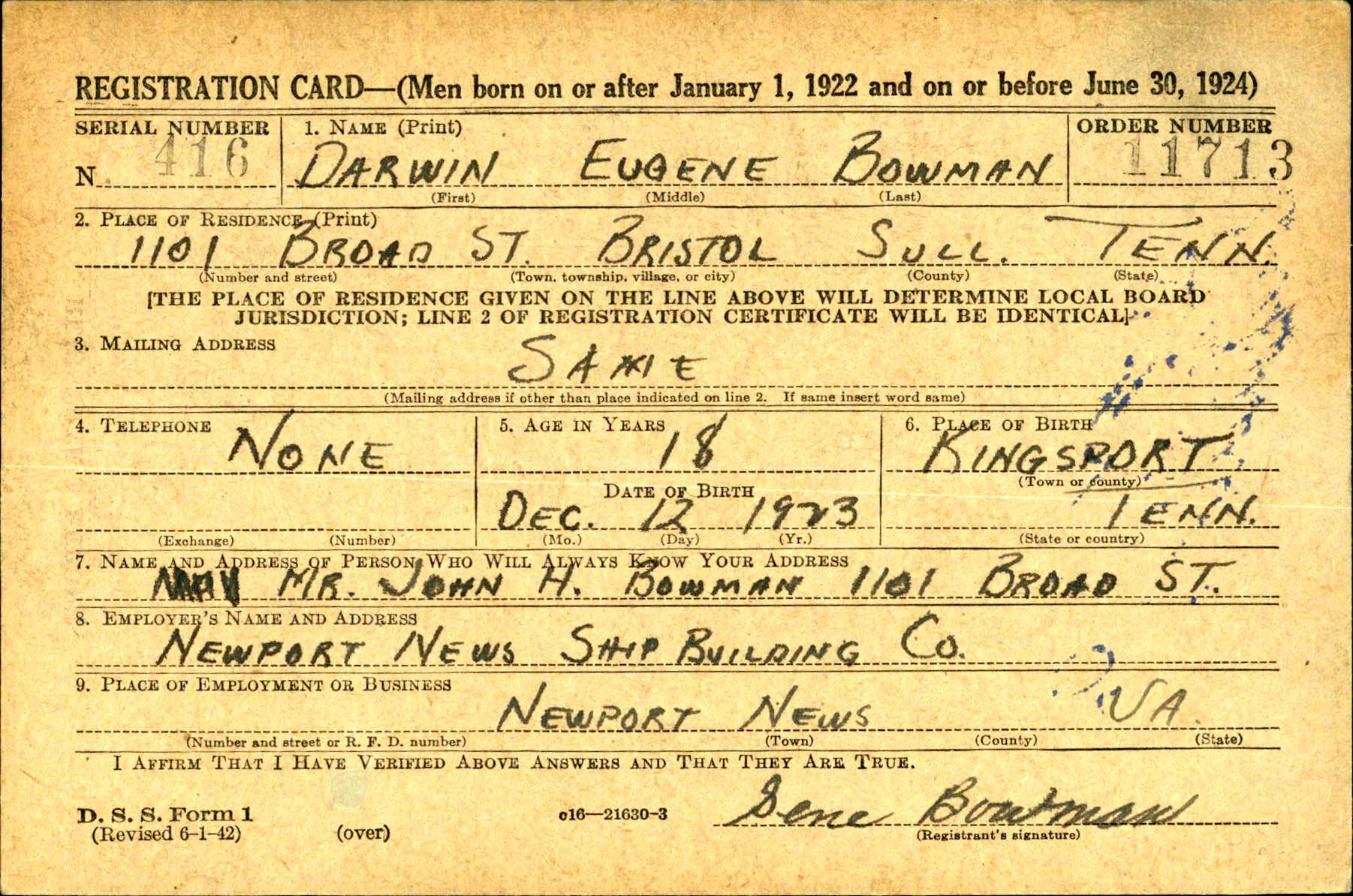 Darwin Eugene “Gene” Bowman was born in Kingsport, Tennessee. He was the son of John Henry Bowman and Mary Augusta Hammer.