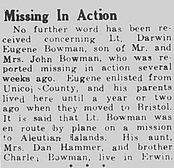 No further word has been received concerning Lt. Darin Eugene Bowman, son of Mr. and Mrs. John Bowman, who was reported missing in action several weeks ago. Eugene enlisted from Unicoi County, and his parents lived here until a year or two ago when they moved to Bristol. It is said that Lt. Bowman was en route by plane on a mission to Aleutian Islands. His aunt, Mrs. Dan Hammer, and brother Charles Bowman live in Erwin.