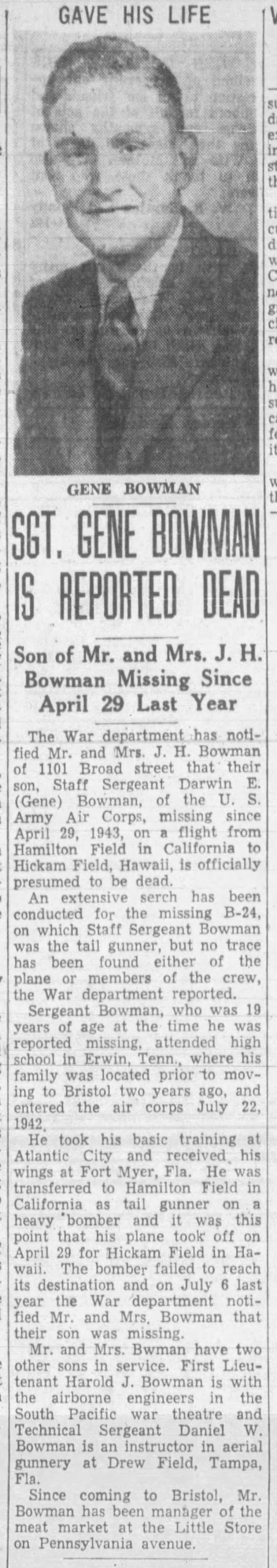 The War department has notified Mr. and Mrs. J.H. Bowman of 1101 Broad street that their son, Staff Sergeant Darwin E. (Gene) Bowman, of the U.S. Army Air Corps, missing since April 29, 943, on a flight from Hamilton Field in California to Hickam Field, Hawaii, is officially presumed to be dead. An extensive search has been conducted for the missing B-24 on which Staff Sergeant Bowman was the tail gunner, but no trace has been found either of the plane or members of the crew, the War department reported. Sergeant Bowman, who was 19 years of age at the time he was reported missing attended high school in Erwin, Tenn., where his family was located prior to moving to Bristol two years ago, and, entered the air corps July 22, 1942. He took his basic training at Atlantic City and received his wings at Fort Myer, Fla. He was transferred to Hamilton Field in California as tail gunner on a heavy bomber and it was this point that his plane took off on April 29 for Hickam Field in Hawaii. The bomber failed to reach its destination and on July 6 last year the War department notified Mr. and Mrs. Bowman that their son was missing. Mr. and Mrs. Bowman have two other sons in service. First Lieutenant Harold J. Bowman is with the airborne engineers in the South Pacific war theatre and Technical Sergeant Daniel W. Bowman is an instructor in aerial gunnery at Drew Field, Tampa, Fla. Since coming to Bristol, Mr. Bowman has been manager of the meat market at the Little Store in Pennsylvania avenue.