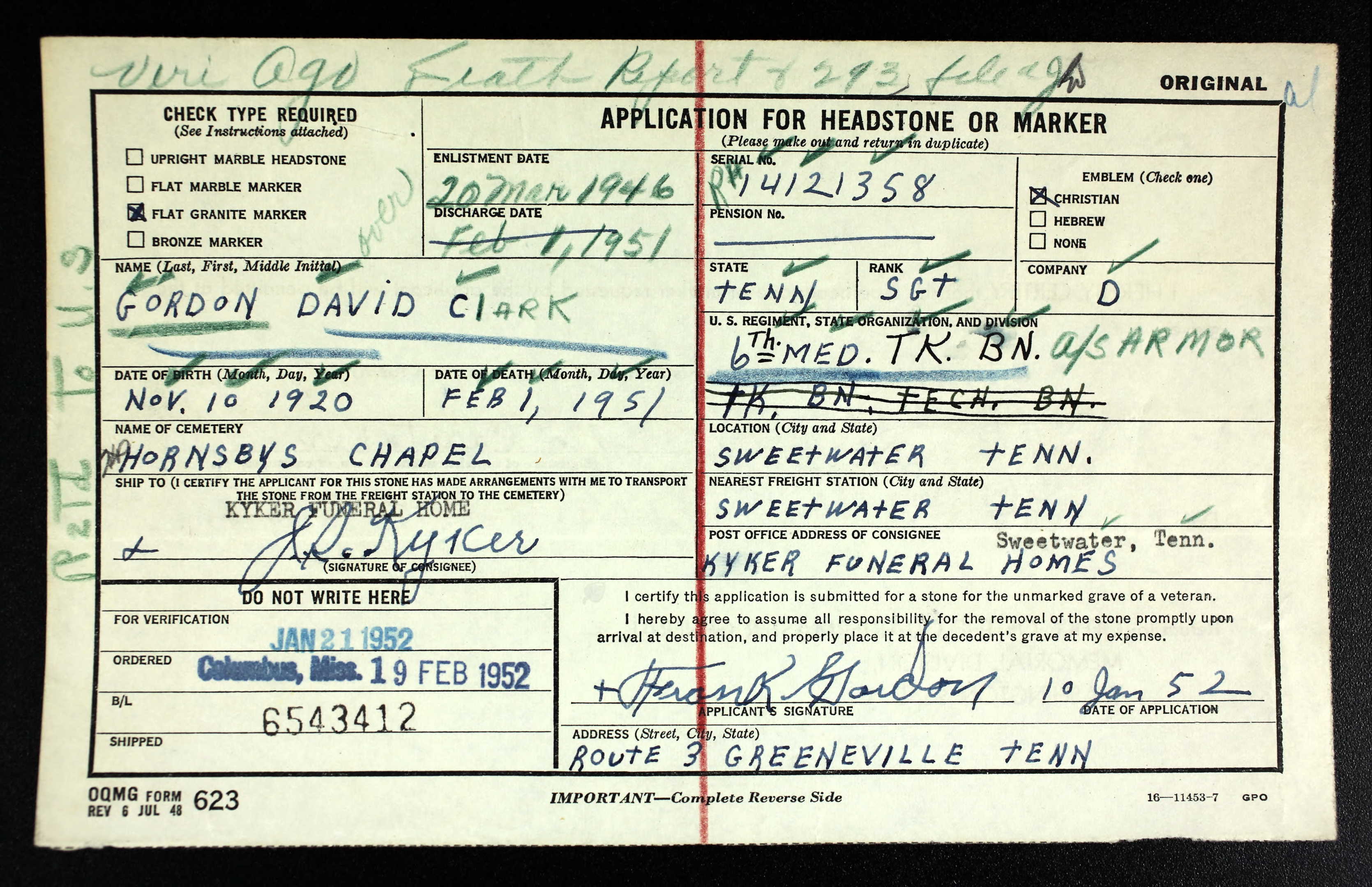 Sergeant David Clark Gordon, from Ten Mile, was born on November 10, 1920. He served in World War II and then enlisted on March 20, 1946 in Fort Oglethorpe, Georgia for service in Hawaii. In Korea, he was a member of Company D, 6th Medium Tank Battalion, 24th Infantry Division. He died of other non-hostile causes on February 1, 1951 at the 4th Field Hosptial at Taegu, South Korea. He is buried in Hornsby Chapel in Meigs County, Tennessee. Sergeant Gordon was awarded the Korean Service Medal, the United Nations Service Medal, the National Defense service Medal, the Korean Presidential Unit Citation, the Republic of Korea War Service Medal and the World War II Victory Medal.