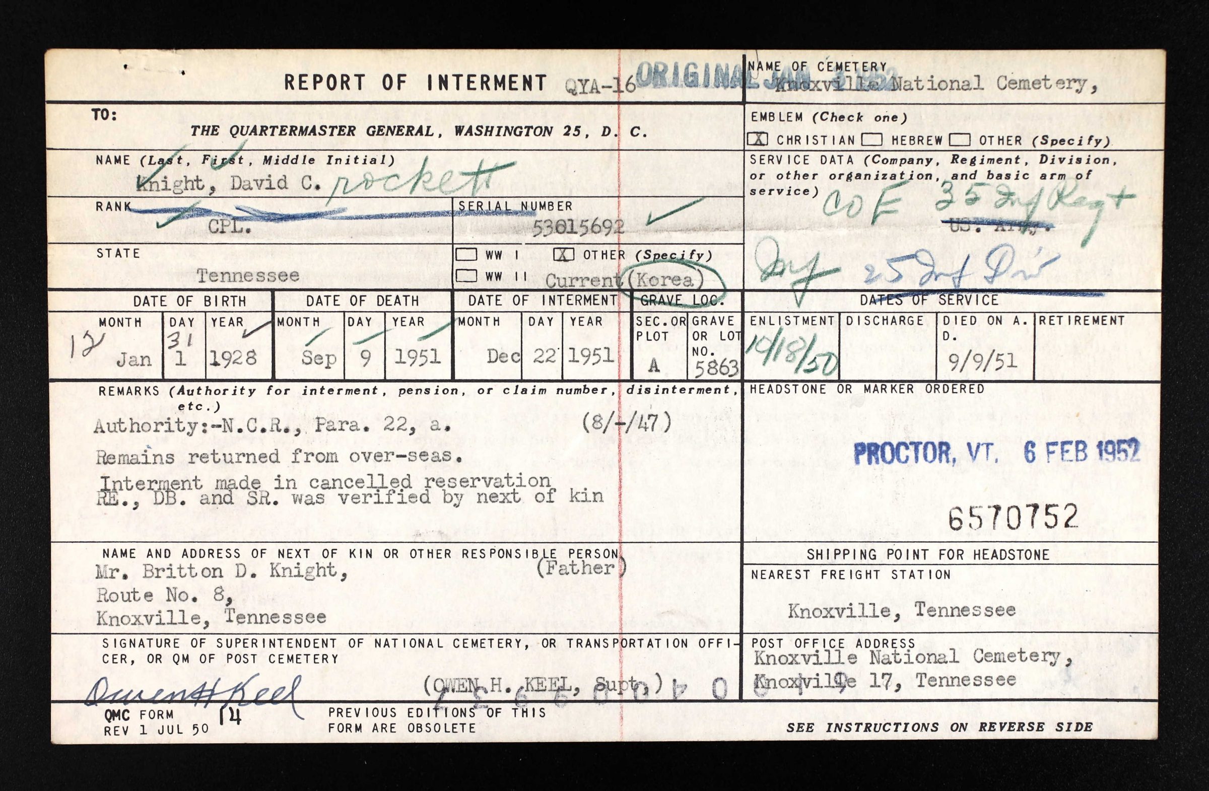 Corporal Knight was returned to Knoxville on December 17, 1951, and funeral services were held December 22, 1951, at Ramsey Heights Baptist Church. He was laid to rest at the National Cemetery in Knoxville with full military honors provided by the American Legion Post #2.