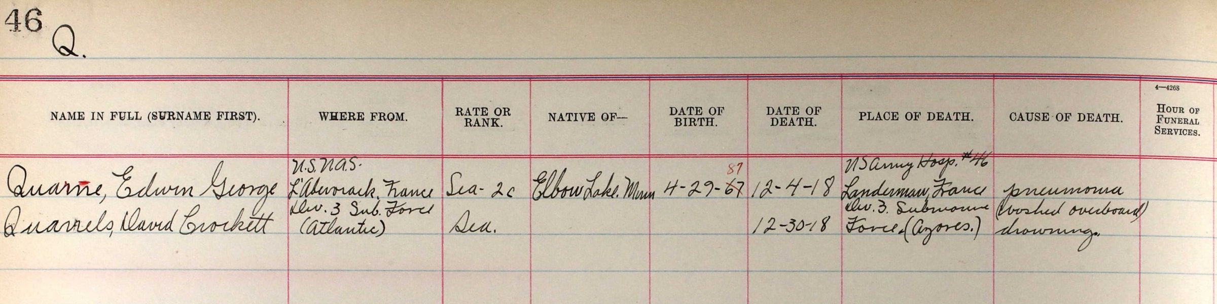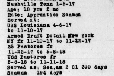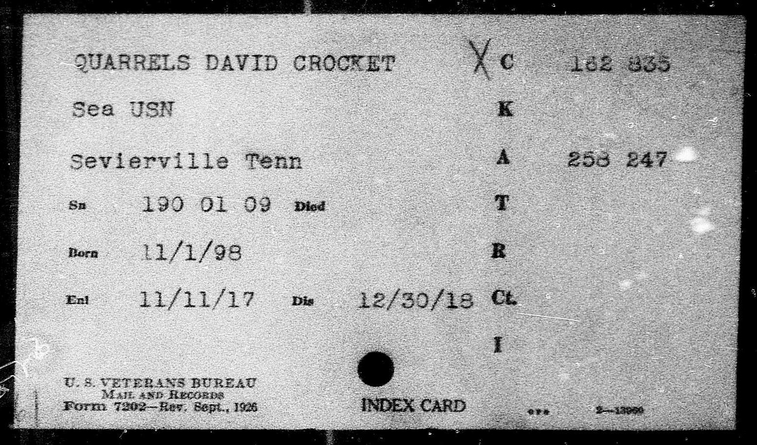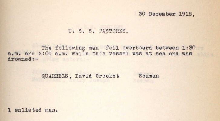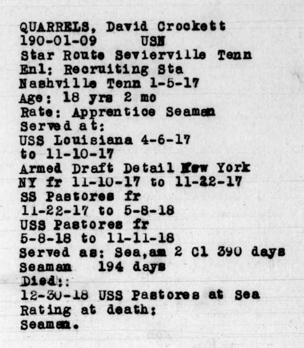 Seaman David Crockett Quarrels was born 22 February 1900 to James McRussell and Sarah A. Maples Quarrels, in Sevier County, TN. Quarrels was shipped aboard the USS Pastores AF-16, a troop transport. He fell overboard between 10 p.m. and 2 a.m. while his vessel was at sea and was drowned. He died on 30 December 1918 and is listed on the Tablets of the Missing at Suresnes American Cemetery, Suresnes, France.