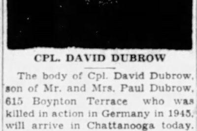 The body of Cpl. David Dubrow, son of Mr. and Mrs. Paul Dubrow, 615 Boynton Terrace, who was killed in action in Germany in 1945, will arrive in Chattanooga today. Interment with military honors.