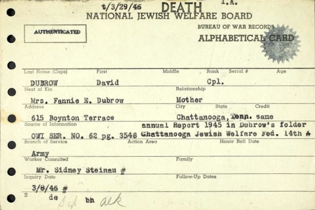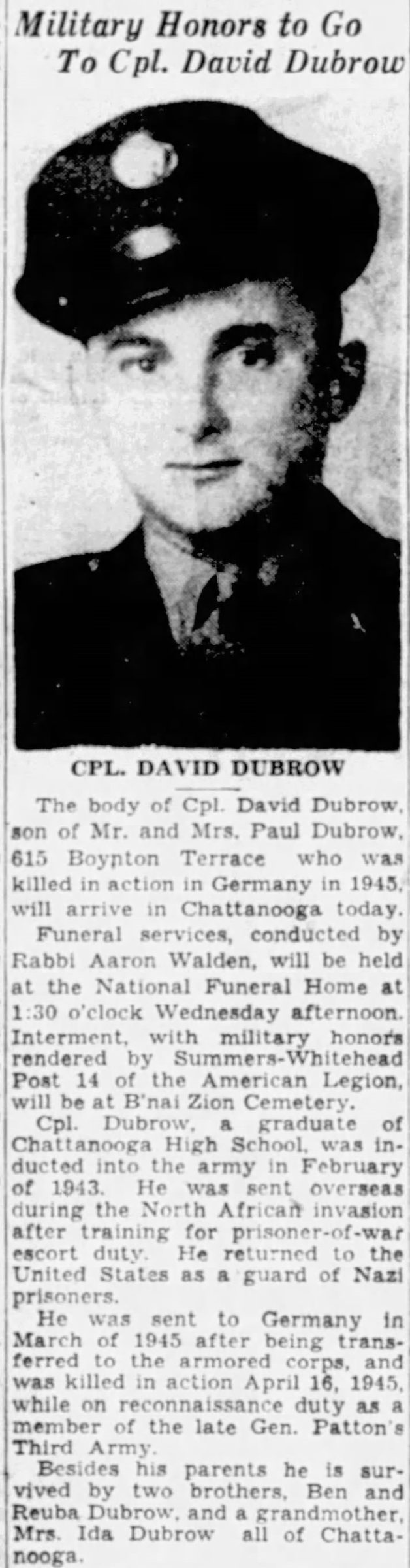 Cpl. Dubrow, a graduate of Chattanooga High School, was inducted into the army in February of 1943. He was sent overseas during the North African invasion after training for prisoner-of-war escort duty. He returned to the United States as a guard of Nazi prisoners. He was sent to Germany in March of 1945 after being transferred to the armored corps, and was killed in action April 16, 1945, while on reconnaissance duty as a member of the late Gen. Patton’s Third Army.