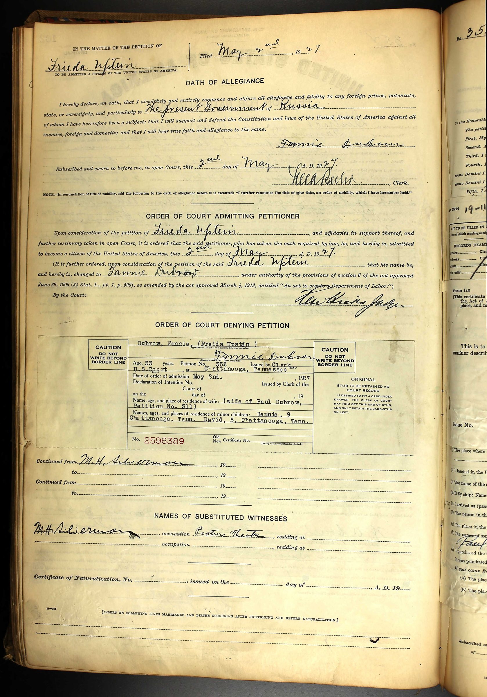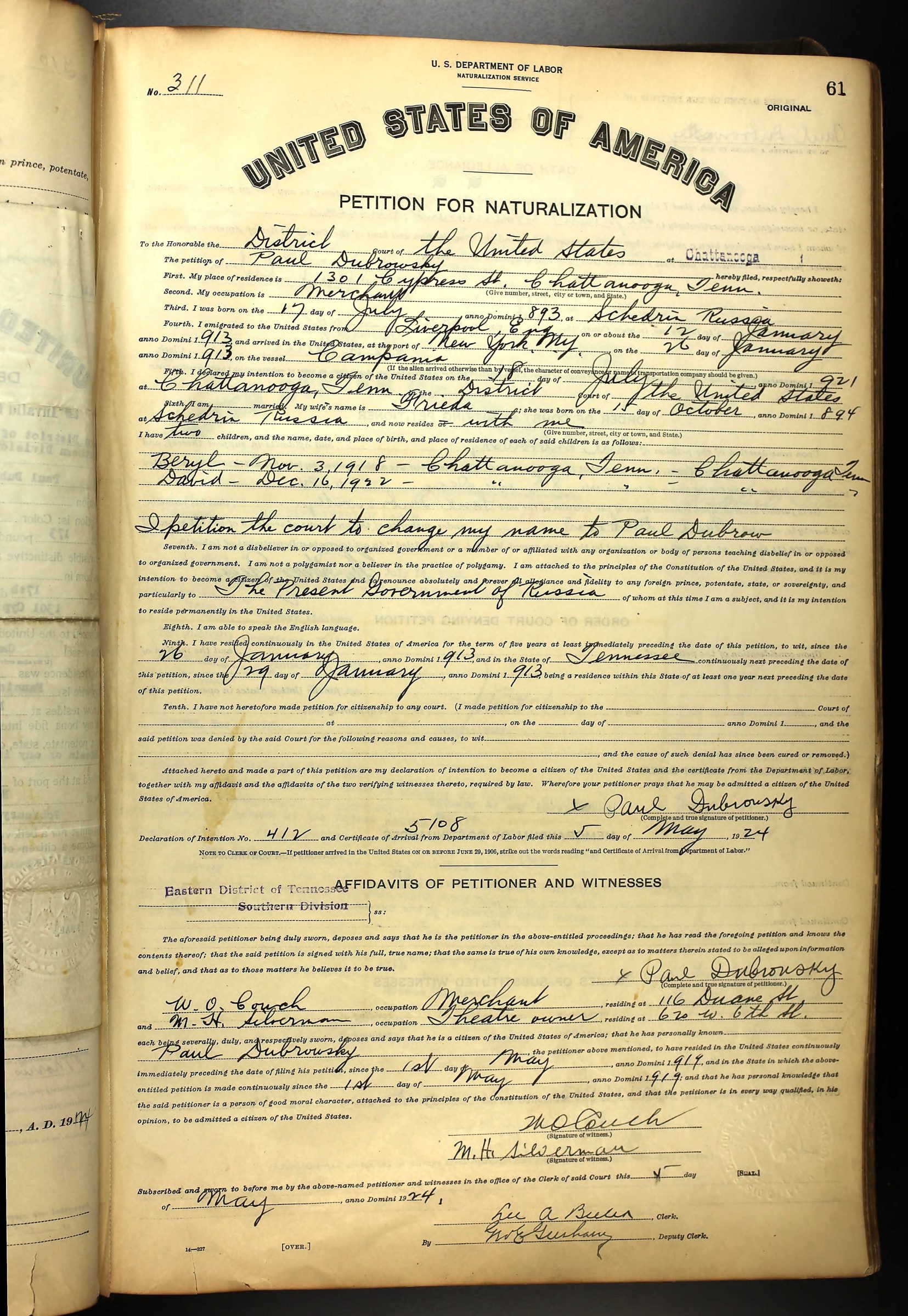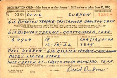 David Dubrow was born on 16 December 1922 in Chattanooga, Tennessee to Paul Dubrowsky and Frieda Upstein. His parents were born in Russia and emigrated to the United States in 1913. His father changed his last name into Dubrow. His mother changed her name from Frieda into Fannie.