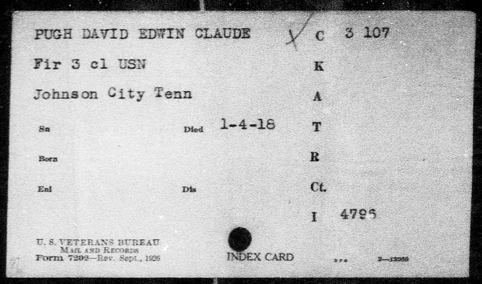 David was born in Johnson City, Washington County, Tennessee on 31 January 1893. He was working as a Locomotive Pipe Fitter with the Carolina, Clinchfield & Ohio Railroad in Erwin, Unicoi County, Tennessee when he decided to enter the United States Navy. David enlisted in Nashville, Tennessee on 10 December 1917 and was dispatched to Norfolk City, Virginia for training as a Fireman due to his civilian training with the railroad. David was assigned to training Company 95 with the rate of Fireman, Third Class when he arrived.