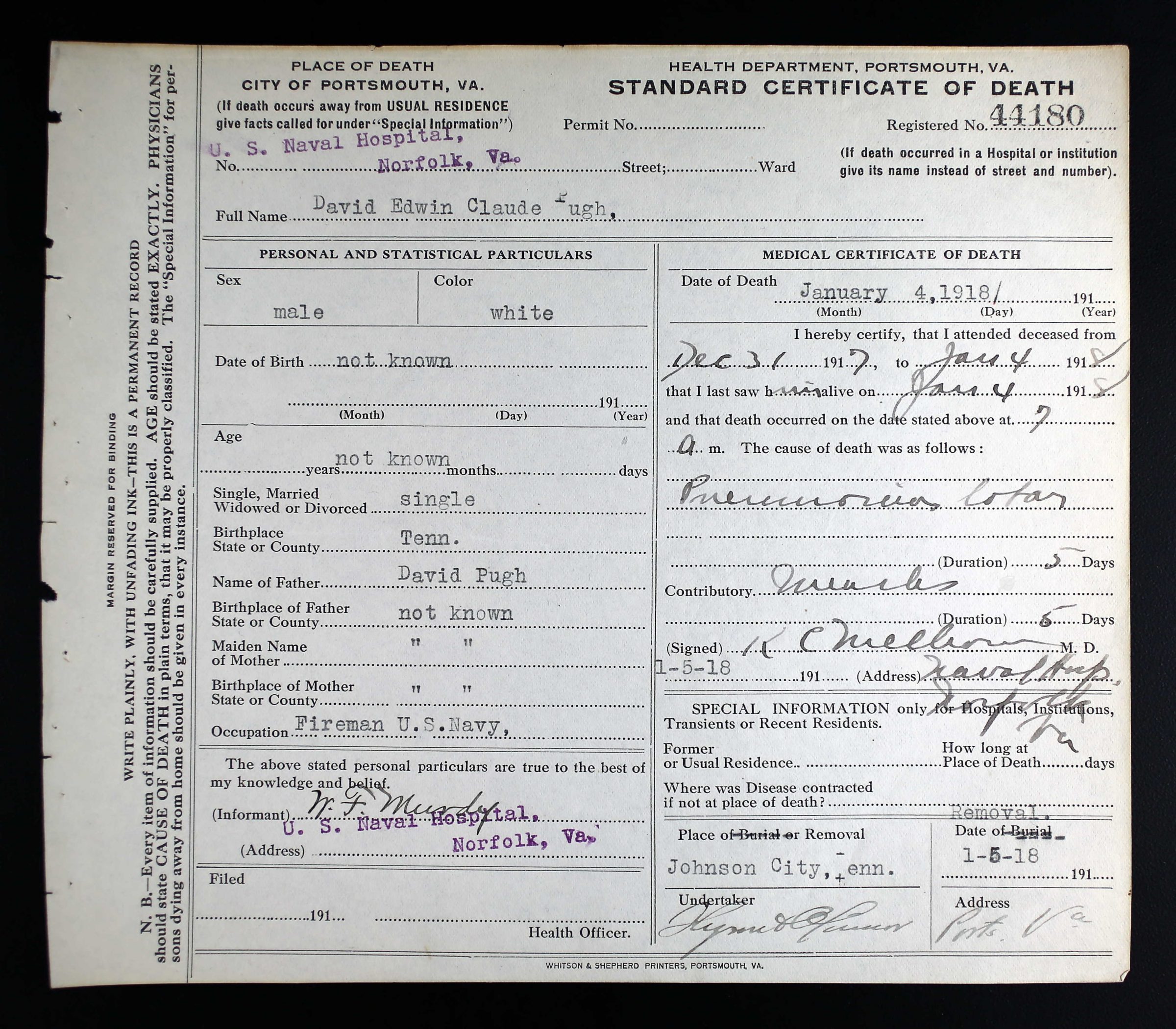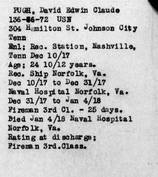 He was admitted to the Norfolk Naval Hospital, Norfolk Naval Base, Norfolk, Virginia on 31 December 1917 with influenza. David died of lobar pneumonia on 4 January 1918 at 7am, he was 24 years old. David rests in the N.G. Taylor Memorial United Methodist Church cemetery near Johnson City in the Okolona Community of Carter County, Tennessee.