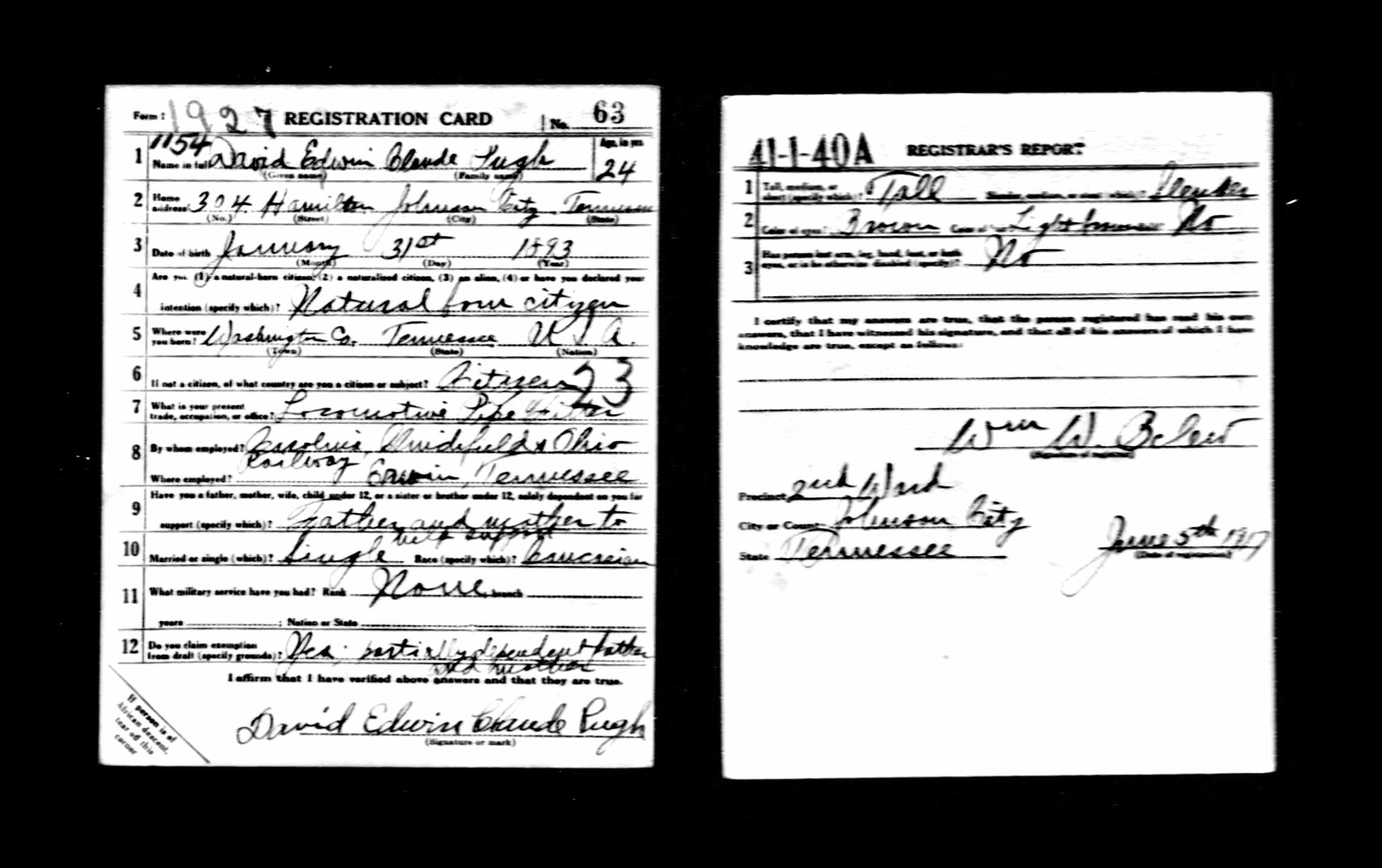 David’s the first child of David William Pugh and Nora Elizabeth Cooper. His brother William Earnest Pugh served in the United States Army during World War I and is interred at the Mountain Home National Cemetery.