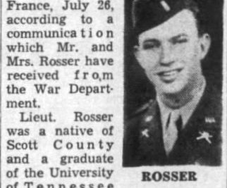 Lt. David E. Rosser, 23, only son of Mr. and Mrs. Edwin J. Rosser, of Oak Ridge, died July 27 from wounds received in action in France, July 26, according to a communication which Mr. and Mrs. Rosser have received from the War Department. Lieut. Rosser was a native of Scott County and a graduate of the University of Tennessee School of Business Administration. He was a member of Sigma Phi Epsilon Fraternity. At the time he entered the service, Lieutenant Rosser was employed in the Commerce Department of TVA. He left for overseas in March, 1944.