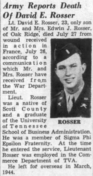 Lt. David E. Rosser, 23, only son of Mr. and Mrs. Edwin J. Rosser, of Oak Ridge, died July 27 from wounds received in action in France, July 26, according to a communication which Mr. and Mrs. Rosser have received from the War Department. Lieut. Rosser was a native of Scott County and a graduate of the University of Tennessee School of Business Administration. He was a member of Sigma Phi Epsilon Fraternity. At the time he entered the service, Lieutenant Rosser was employed in the Commerce Department of TVA. He left for overseas in March, 1944.