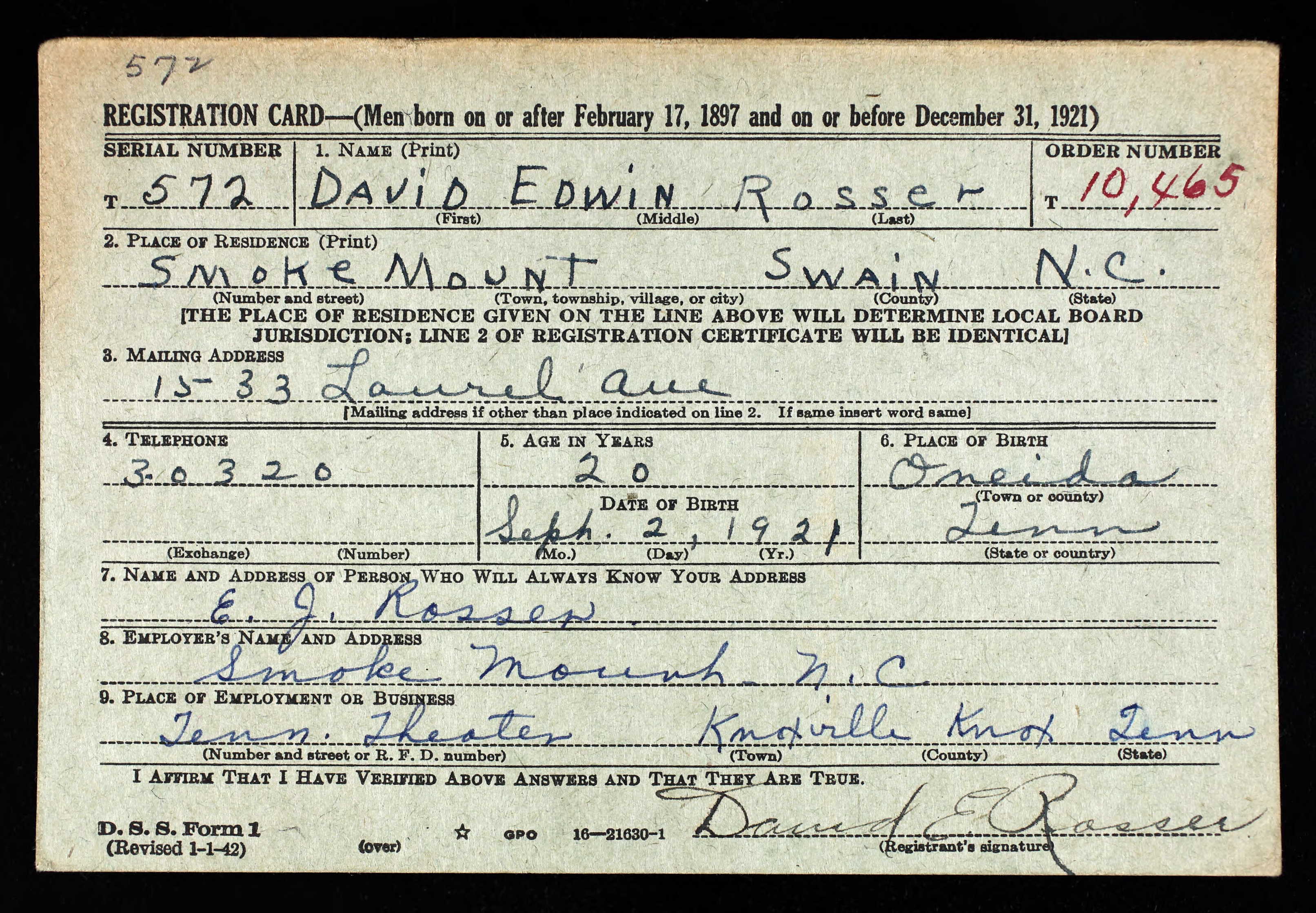David Edwin Rosser was born on 2 September 1921 in Oneida, Tennessee, the son of Edwin Jennings Rosser and Edna Madeline Smith.