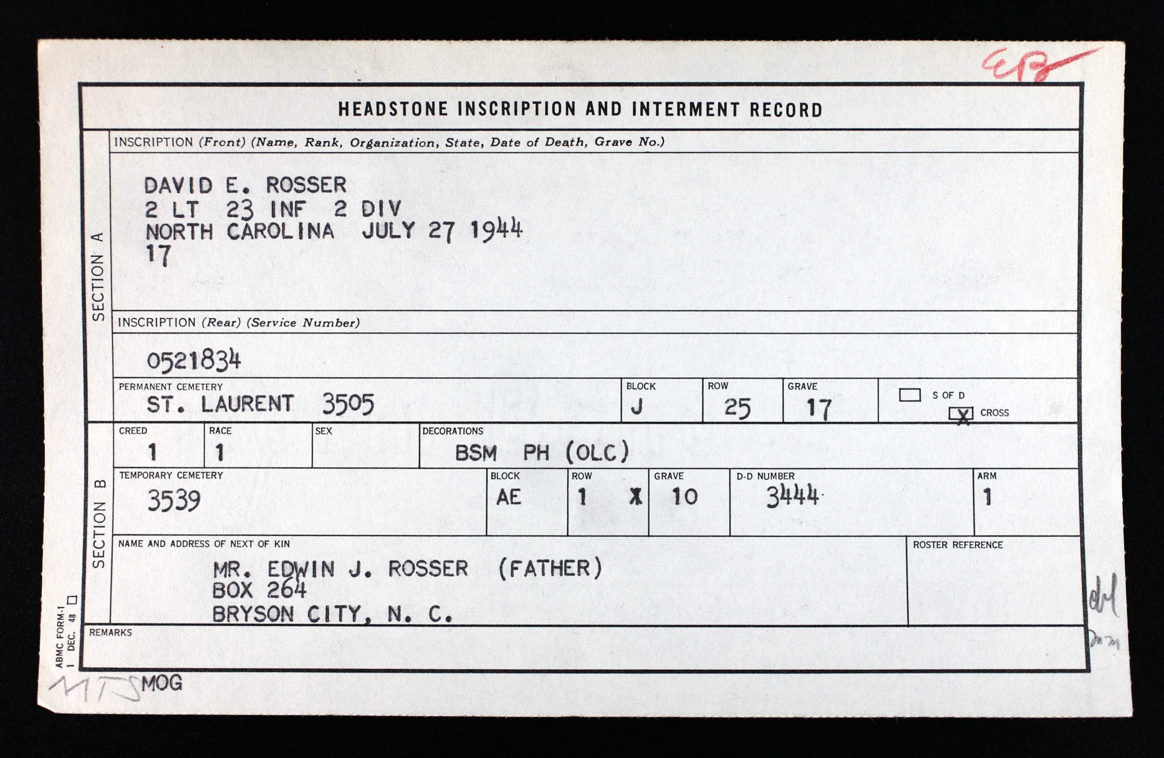 He was initially buried at La Cambe Cemetery at Isigny, France and reburied at the Normandy American Cemetery, Colleville-sur-Mer, France, J, 25, 17