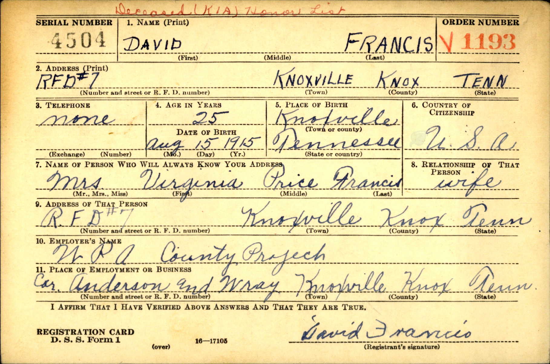 David Francis was the son of Carson Lafayette Francis and Malinda Belle “Linnie” Sherman. Siblings: Lille L. Francis, Carson E. Francis, John Francis and Marvin R. Francis