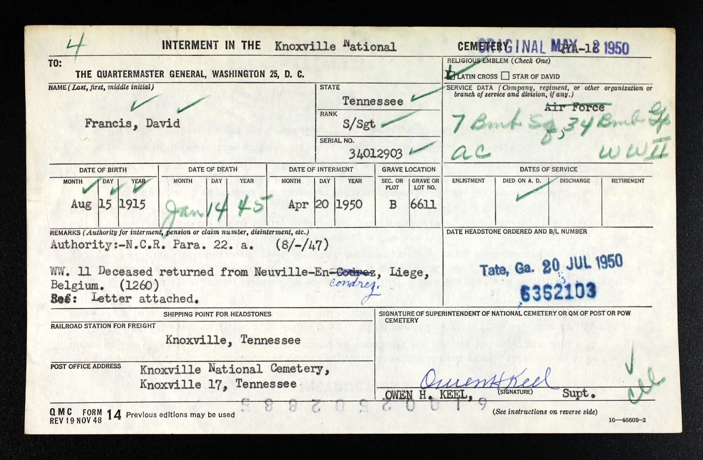 - Burial/Memorial Location: Knoxville National Cemetery, Knoxville, TN