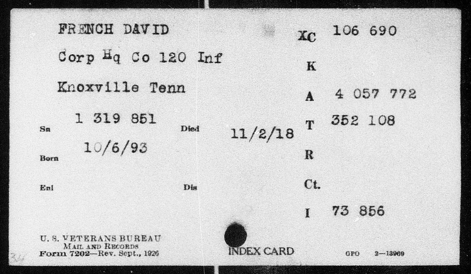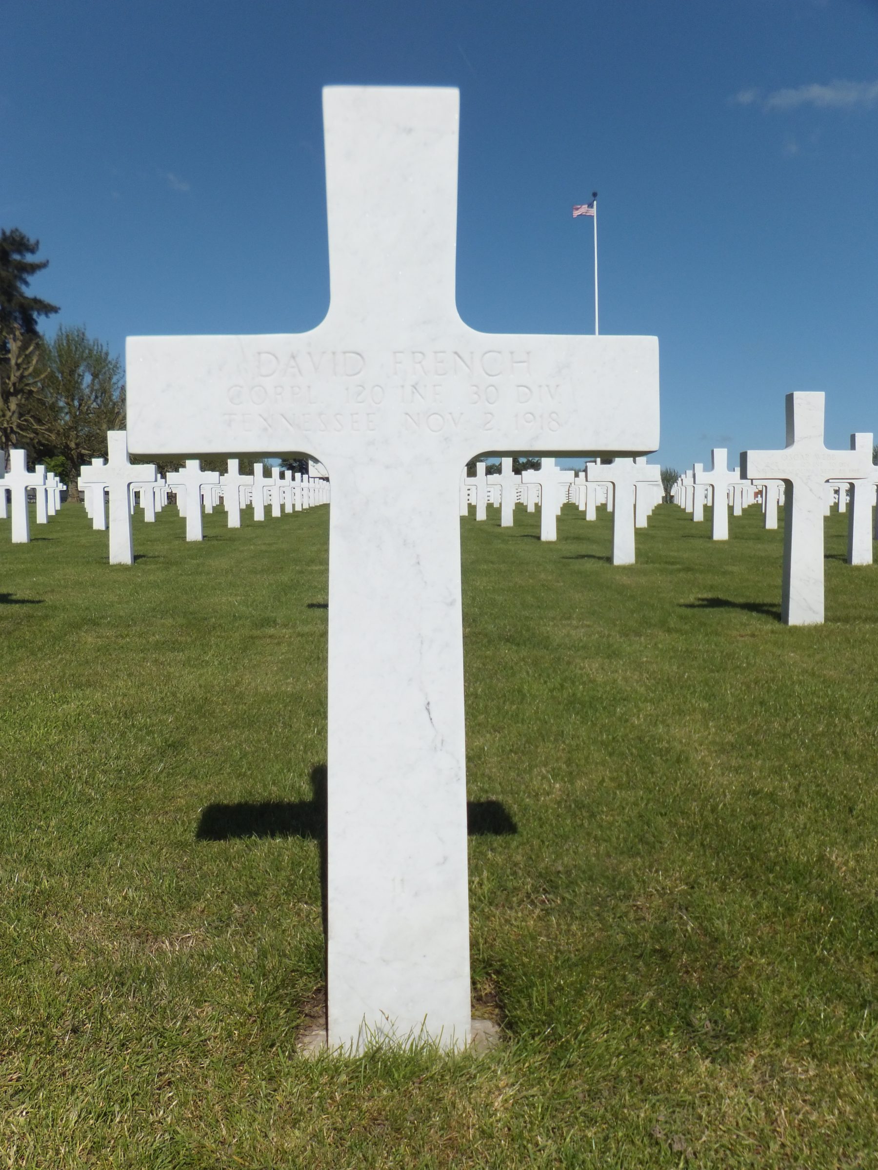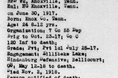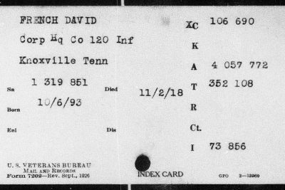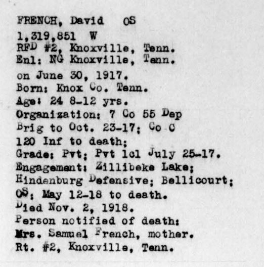 Sergeant David French enlisted in the Second Tennessee Infantry at Knoxville in June 1917. After arrival at Camp Sevier, SC, he was transferred to the 120th Infantry with which he trained until his departure overseas May 11, 1918. Went through all fighting of his regiment up to the last day, October 19, 1918, when he was fatally wounded. He died from his wounds November 2.