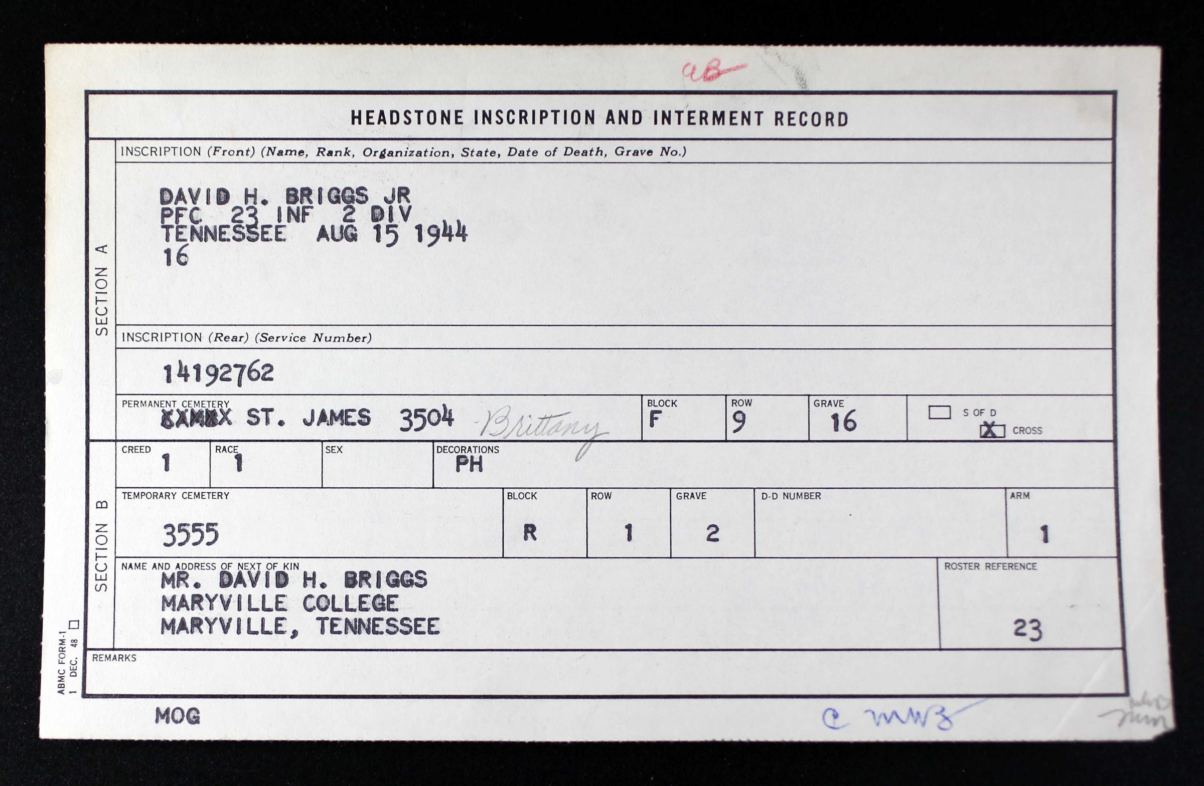 Private First Class David H. Briggs, Jr., served in the 23rd Infantry Regiment, 2nd Infantry Division. He died on August 15, 1944. He is buried in the Brittany American Cemetery in St. James (Manche), France (Plot F, Row 9, Grave 16).