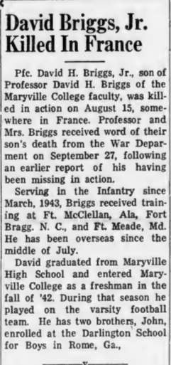 Pfc. David H. Briggs, Jr., son of Professor David H. Briggs of the Maryville College faculty, was killed in action on August 15, somewhere in France. Professor and Mrs. Briggs received word of their son’s death from the War Department on September 27, following an earlier report of his having been missing in action. Serving in the Infantry since March, 1943, Briggs received training at Fort McClelaln, Alabama, Fort Bragg in North Carolina and Fort Meade in Maryland. He has been overseas since the middle of July.