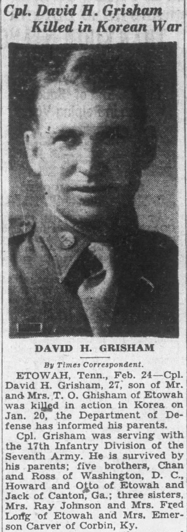Cpl. David H. Grisham, 27, son of Mr. and Mrs. T.O. Grisham of Etowah was killed in action in Korea on Jan. 20, the Department of Defense has informed his parents. Cpl. Grisham was serving with the 17th Infantry DIvision of the Seventh Army. He is survived by his parents; five brothers, Chan and Ross of Washington, D.C., Howard and Otto of Etowah and Jack of Canton, Ga.; three sisters, Mrs. Ray Johnson and Mrs. Fred Long of Etowah and Mrs. Emerson Carver of Corbin, Ky.