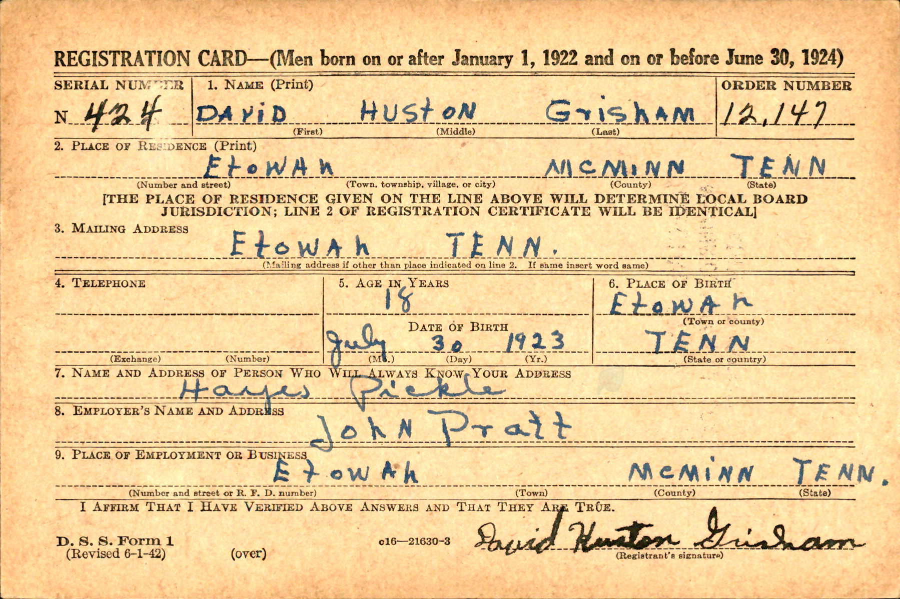 David Houston Grisham was born on 30 July 1923 in Etowah, Tennessee to Oscar James Grisham and Brazle Morira Loveday.