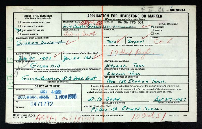 Corporal Grisham was a member of the 17th Infantry Regiment, 7th Infantry Division. He was Killed in Action while fighting the enemy in South Korea.