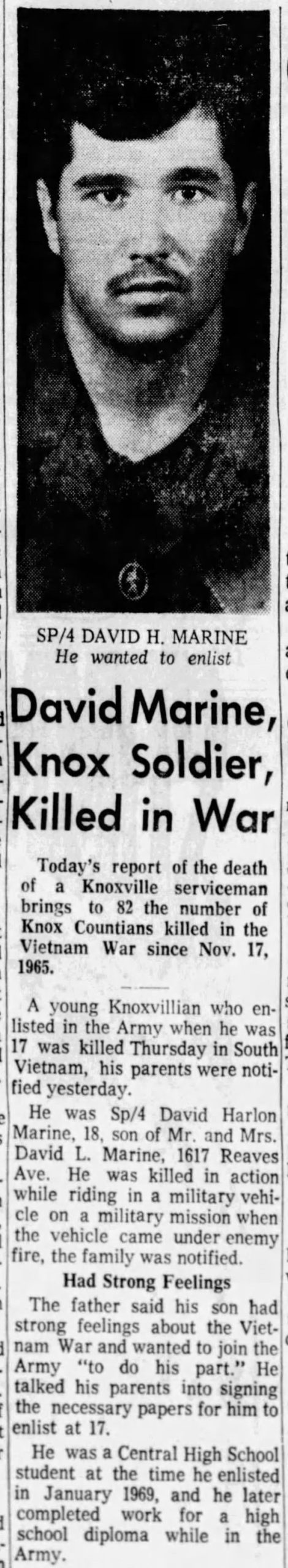 We always joked David was the only Marine in the Army. He was actually in the 82nd but attached to our unit. Marine and I became buddies right away because he just had an easy going personality. We had it set up to be gunners on choppers so we could be closer to fighting but on that fateful day our unit was convoying down a mountain pass on QL21 toward Nha Trang when we were ambushed with mortars and small arms fire. Marine was on a 60 in the back of a truck when he was hit. A chopper picked him up right away but the wound was too serious. When our convoy was preparing to leave that morning I tried to get him to ride in the crane with me but he was determined to man a machine gun. Also on that morning the American Flag became entangled on the flag pole where they could not get it down with the rope so I positioned the crane boom by the flag and Marine climbed it and brought the flag down. I never imagined in two more hours he would be dead. Bless his heart and family.