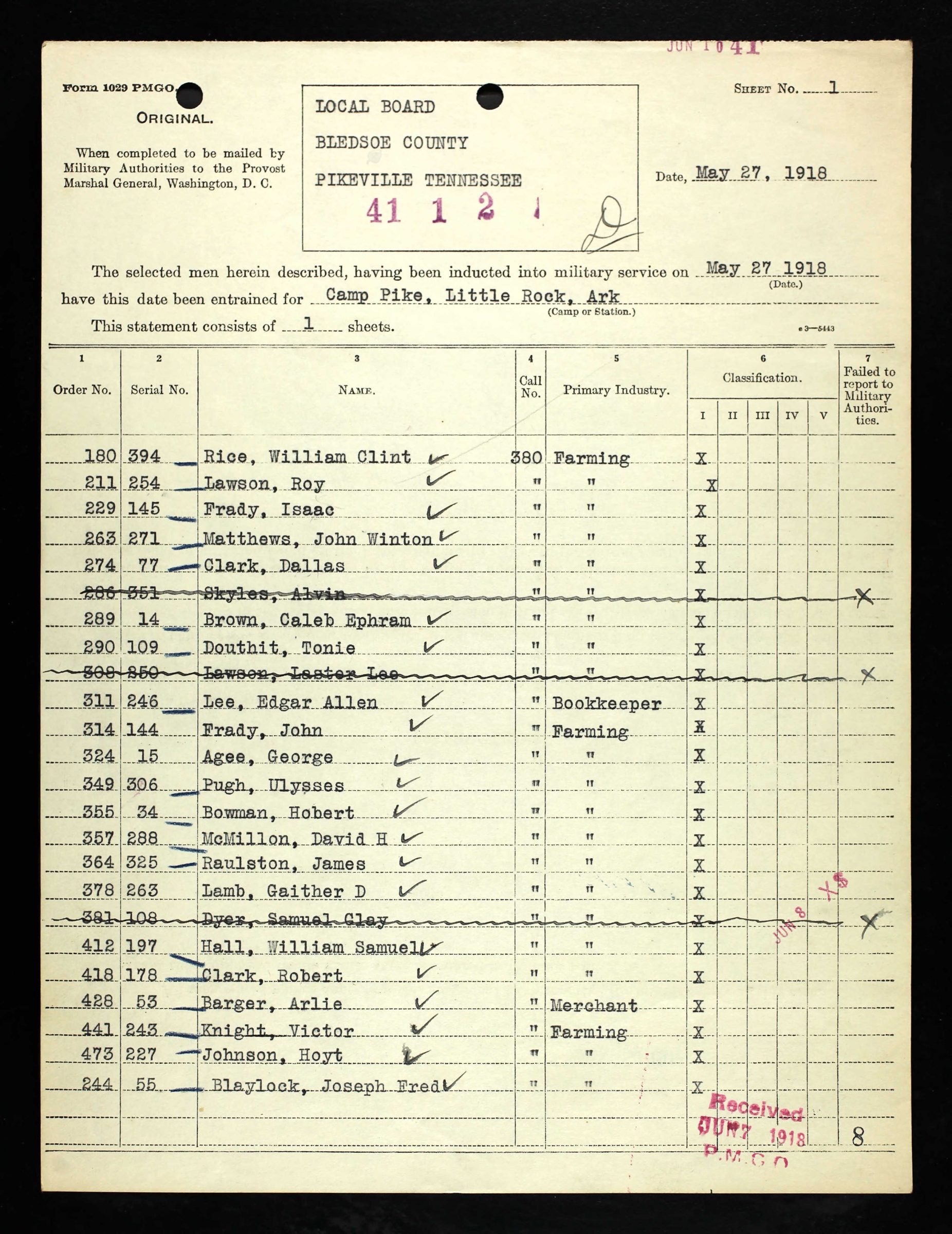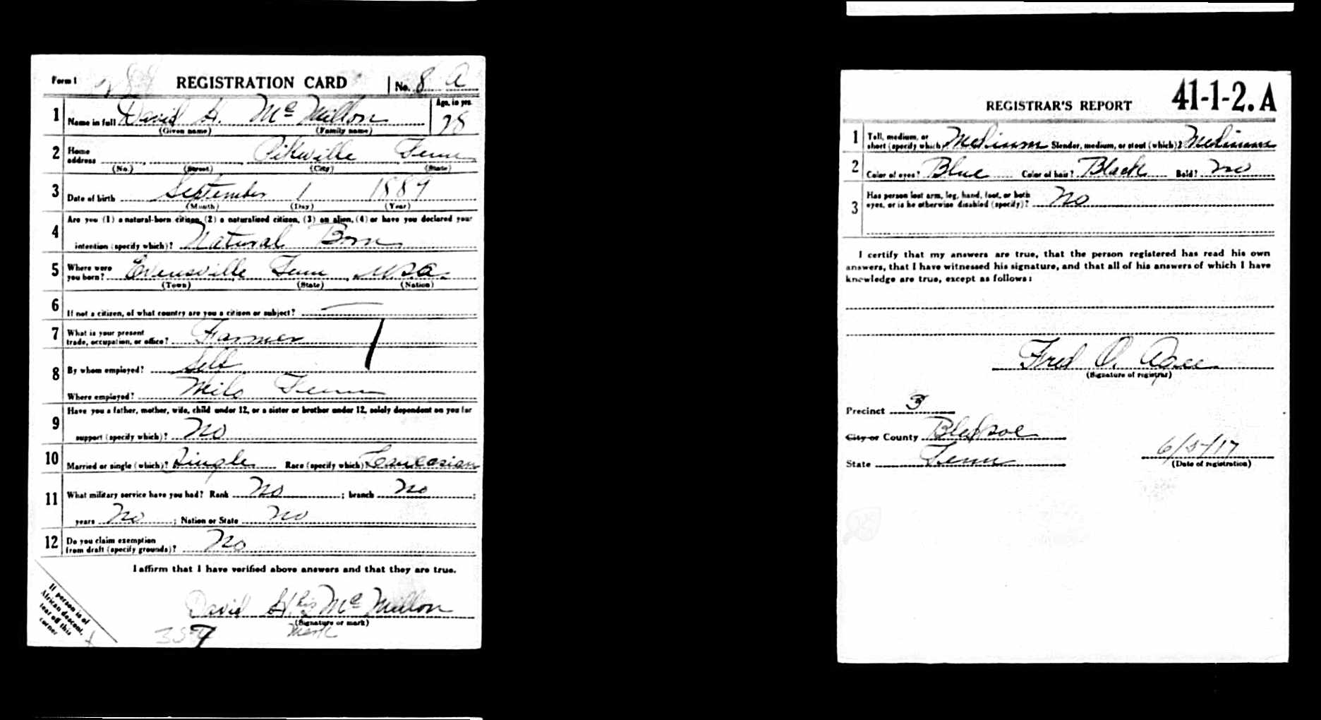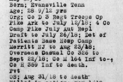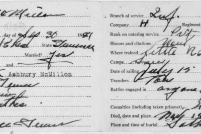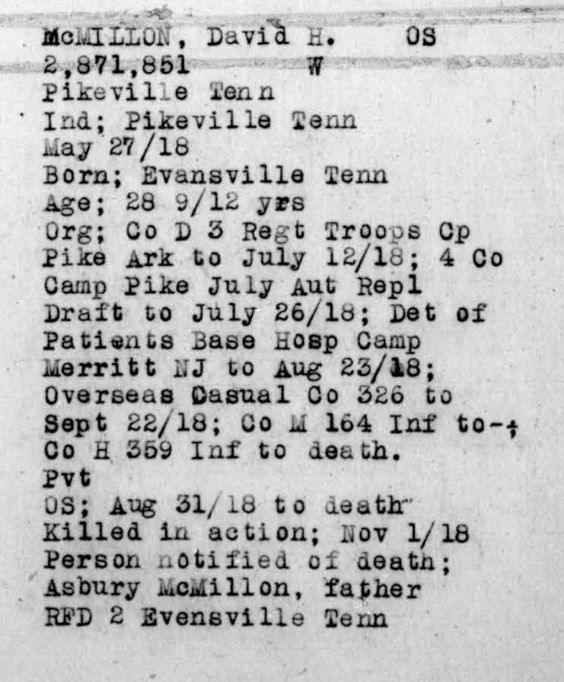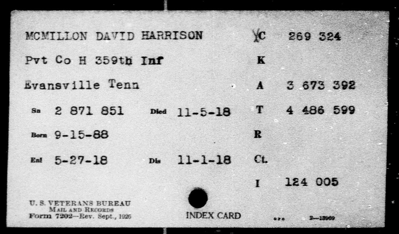 David Harrison McMillon was born in Evensville, Tennessee, on September 15, 1889. He was the son of William Asbury McMillon and Edna Christine Rose. He married Dosha Lester on April 23, 1915, in Tennessee. Private David H. McMillon was a member of Company H, 359th Infantry and was killed in action on November 1, 1918 in France. He died at age 28. His wife and unborn child died January 13, 1917.