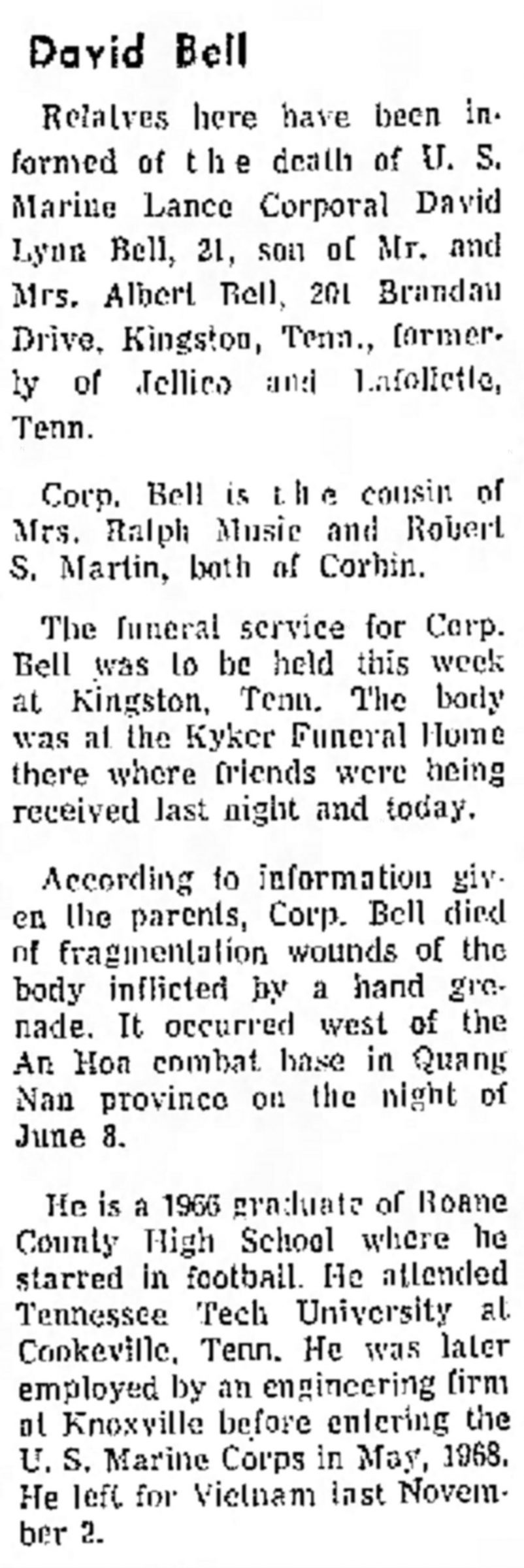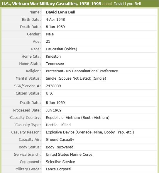 Lance Corporal David Lynn Bell was born on April 4, 1948, and was originally from Kingston, Tennessee. He served his country in the Vietnam War in the United States Marine Corps, as a rifleman in A Company, 1st Battalion, 5th Marines, 1st Marine Division. His tour in Vietnam began on November 9, 1968. On June 8, 1968, LCpl. Bell was killed by an explosive device under hostile conditions in Quang Nam province, South Vietnam; he was 21 years old at the time of his death. LCpl. Bell is buried at Kingston Memorial Gardens in Kingston, Tennessee, and is memorialized on the Vietnam Veterans Memorial on Panel 23W, Line 109.