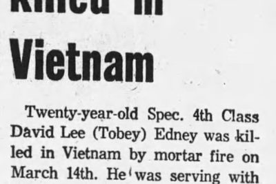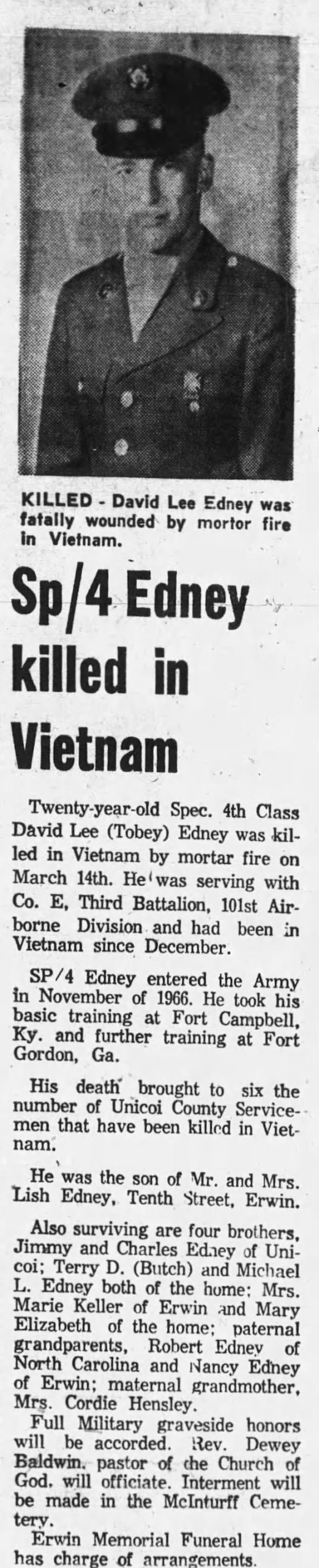 Twenty-year-old Sepc. 4th Class David Lee (Tobey) Edney was killed in Vietnam by mortar fire on March 14th. He was serving with Co. E, Third Battalion, 101st Airborned Division and had been in Vietnam since December. Sp/4 Edney entered the Army in November of 1966. He took his basic training at Fort Campbell, Ky. and further training at Fort Gordon, Ga. His death brought to six the number of Unicoi County Servicemen that have been killed in Vietnam. He was the son of Mr. and Mrs. Lish Edney, Tenth Street, Erwin.