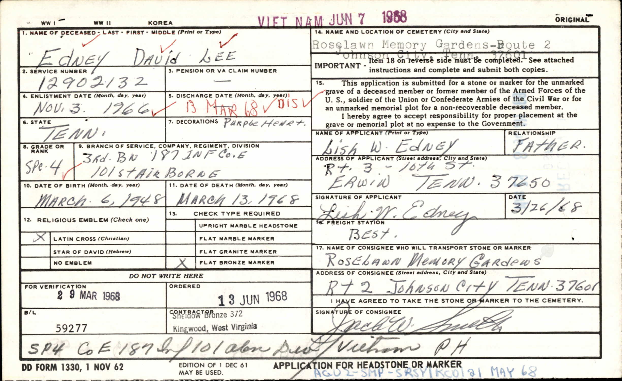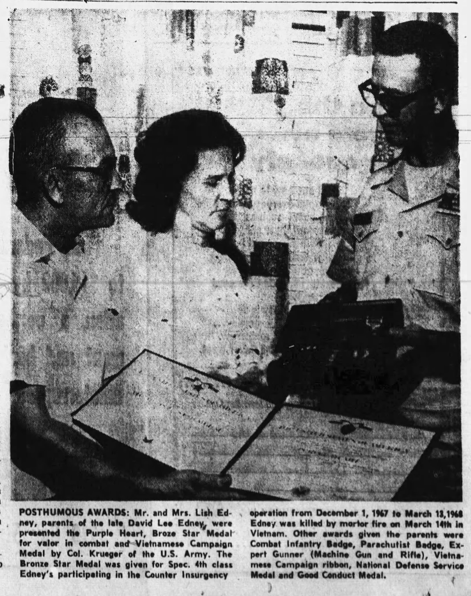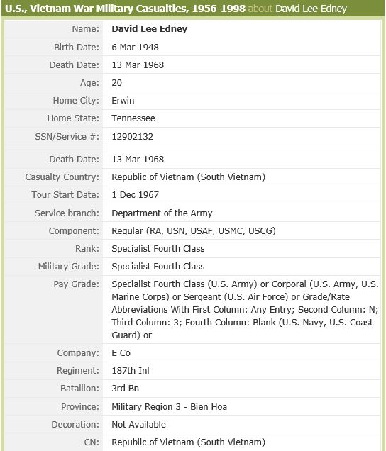 David Lee Edney was killed in action in the Bein Hoa province of South Vietnam while serving with E CO, 3rd BN, 187th Infantry, 101st Airborne Division.