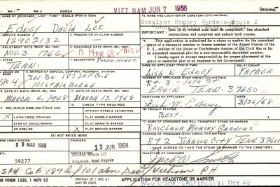David Lee Edney “Toby” and my husband were the best of friends. They met in some of the schools they had to go through. Both were airborne “skysoldiers”. They were stationed at Ft. Bragg together and we would all come home for the weekends. Toby lived in Erwin, TN, and us in Harriman, TN. We stayed at the Edney’s, and Toby stayed with us in Harriman. Toby went over to Vietnam in Dec. 1967 with the 101st Airborne, and Jerry went in Feb. 1968 with the 173rd Airborne Birgade. Toby got KIA 13 March 1968 and Jerry was his escort home. Jerry left to go back to Vietnam 13 April and he got KIA 13 June 1968. I got pregnant with our son while Jerry was in and had him 24 Dec. 1968 and named him Jerry Lee after his daddy and Toby.