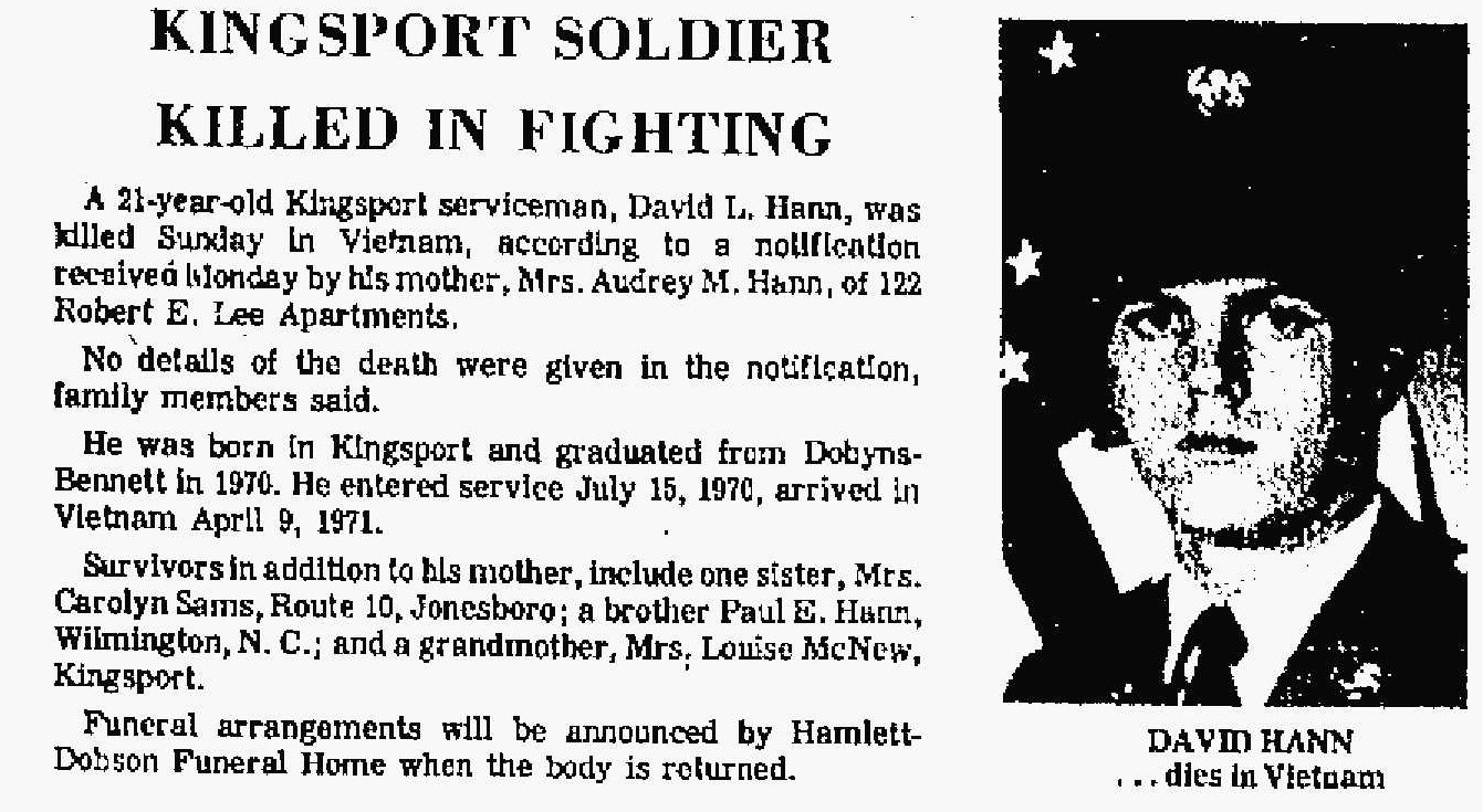 A 21-year old Kingsport serviceman, David L. Hann, was killed Sunday in Vietnam, according to a notification received Monday by his mother, Mrs. Audrey M. Hann, of Robert E. Lee Apartments.
