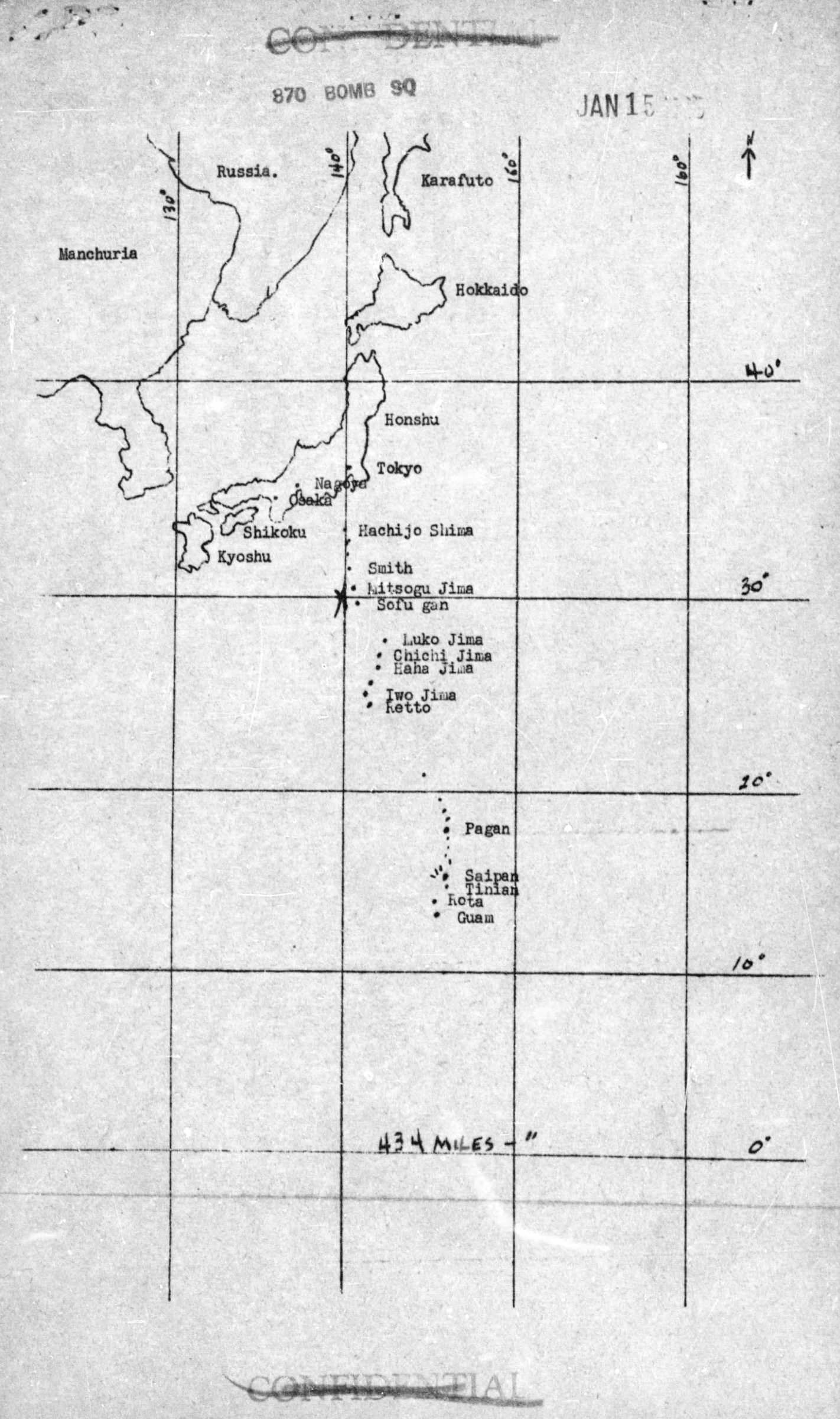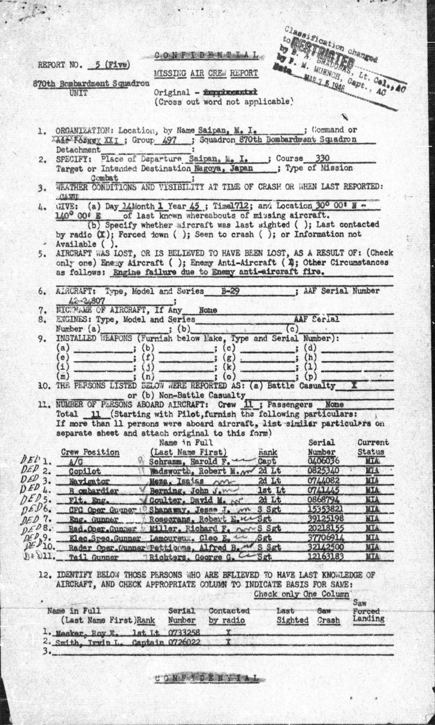 On January 14, 1945 the crew lost an engine on a bomb run and could not feather the prop. The prop windmilled off and the B29 lost second engine. The crew radioed intention to ditch over the Southwest Pacific.”