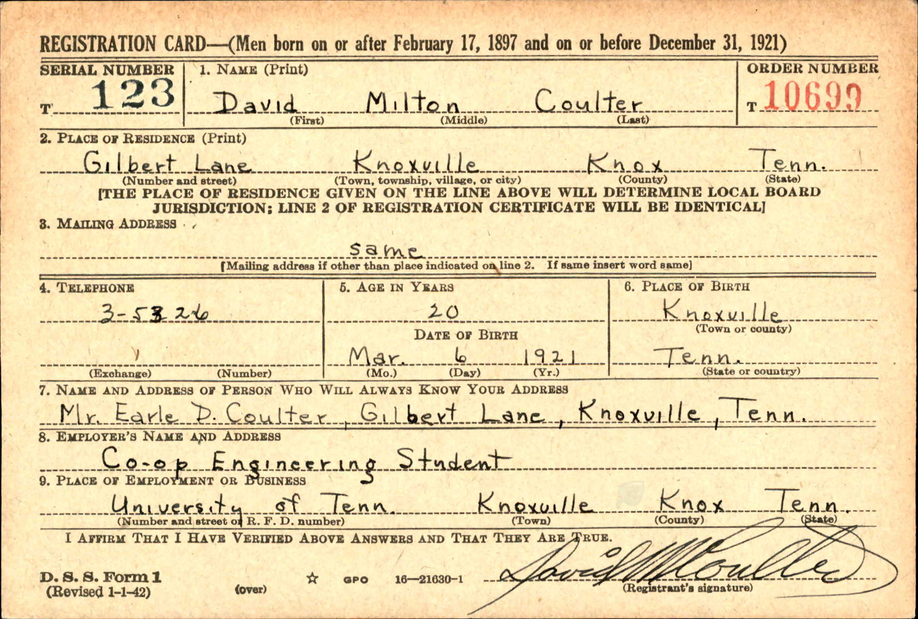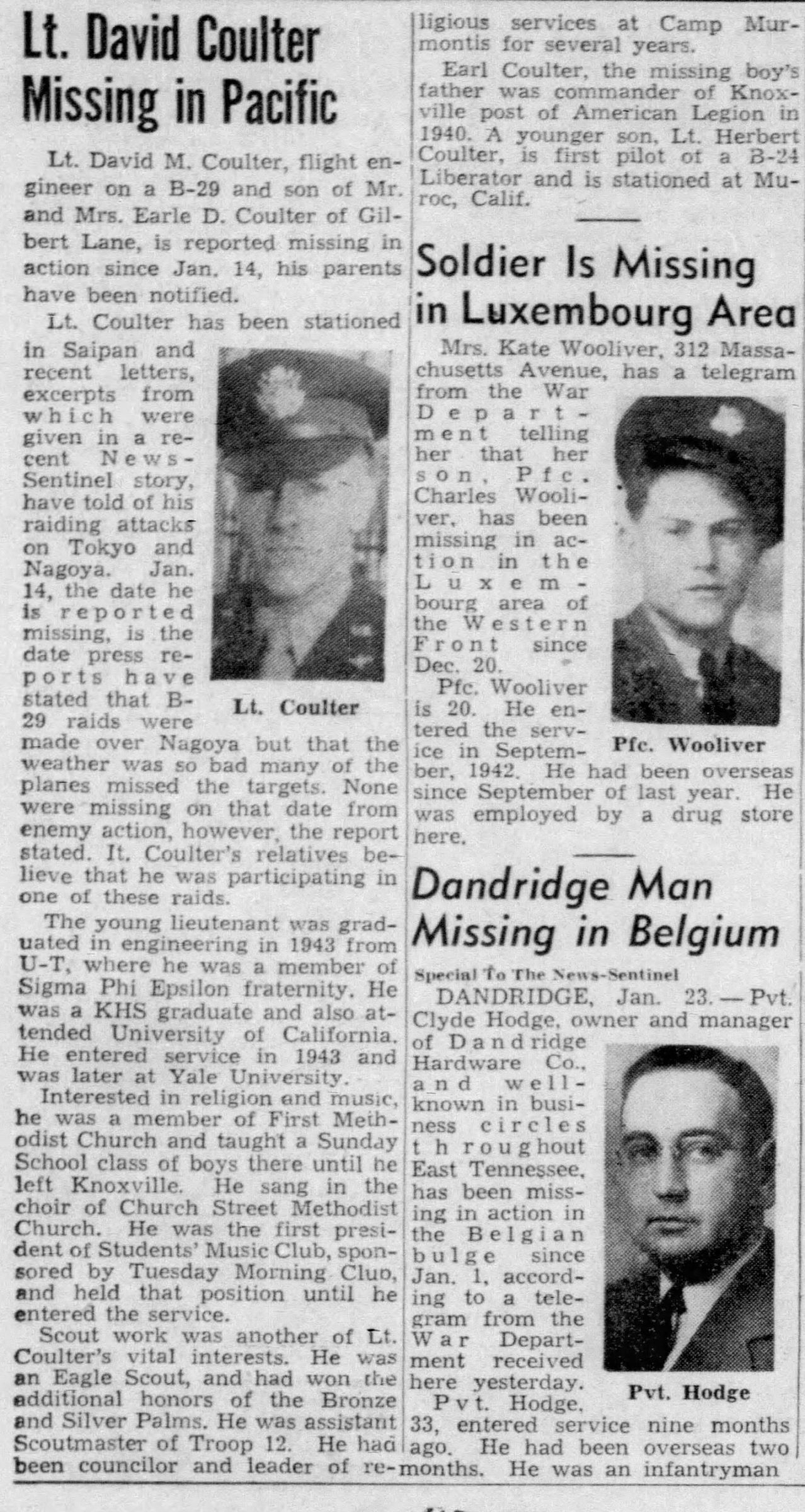 Second Lieutenant David Milton Coulter was in the Army Air Forces and was listed missing in action and later declared dead on January 15, 1946. His B29 Super Fortress went down off the coast of Saipan during the war. He was the son of Earle Dewey Coulter and Hettie Elmer Heninger Coulter of Knoxville. He was a student at the University of Tennessee.