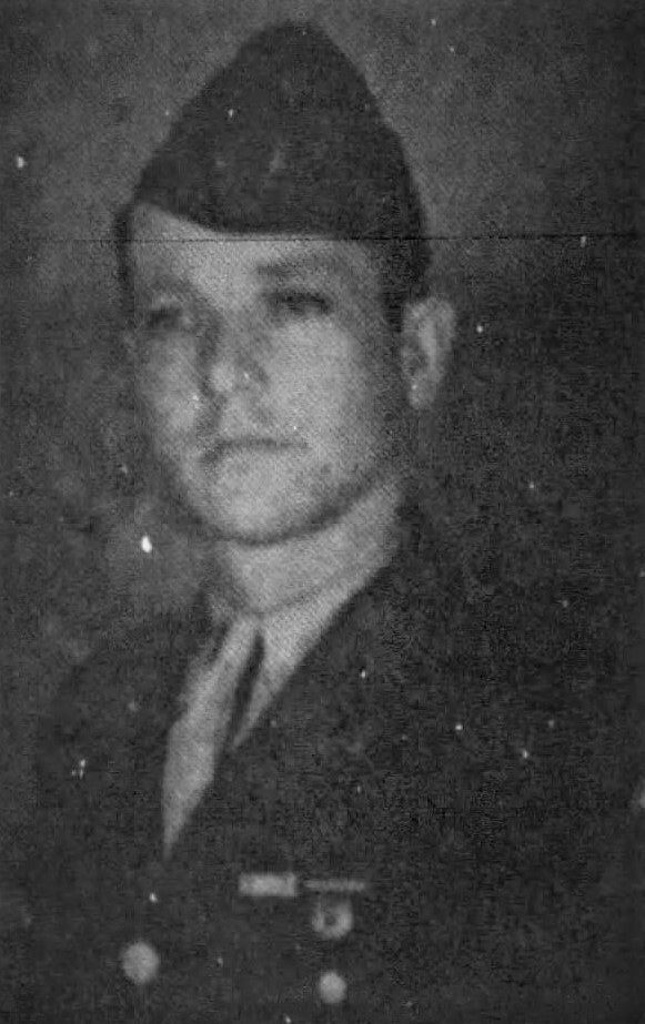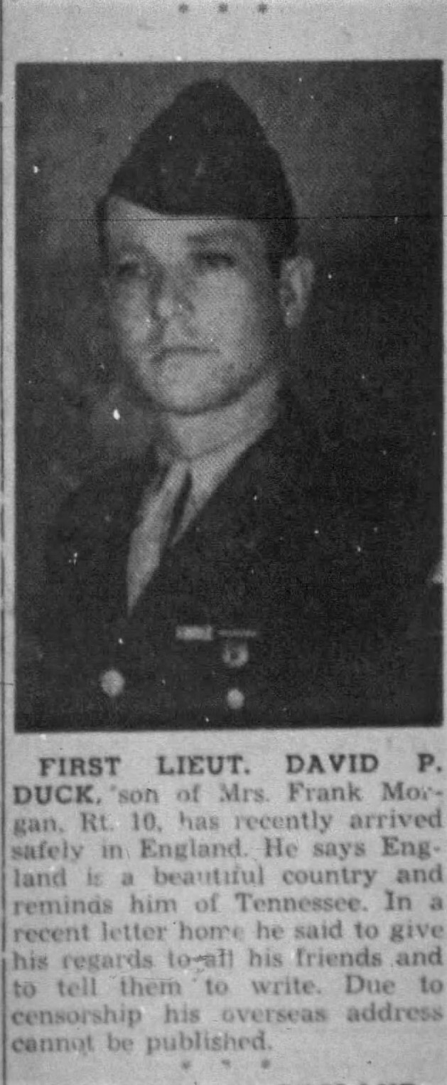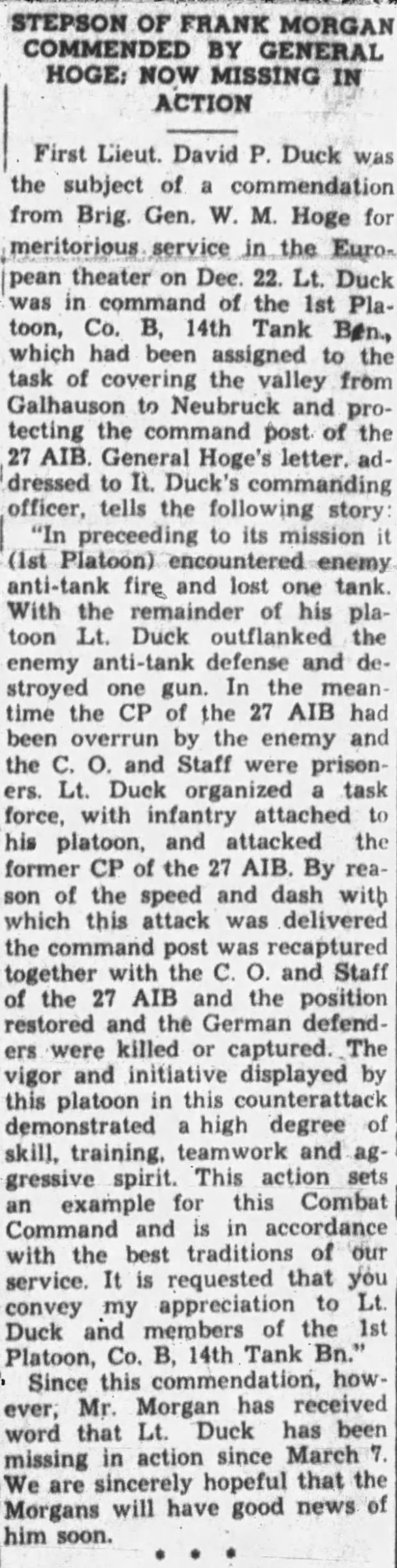 First Lieut. David P. Duck was the subject of a commendation from Brig. Gen. W.M. Hoge for meritorious service in the European theater on Dec. 22. Lt. Duck was in command of the 1st Platoon, Co. B, 14th Tank Bn., which had been assigned to the task of covering the valley from Galhauson to Neubruck and protecting the command post of the 27 AIB. General Hoge’s letter, addressed to Lt. Duck’s commanding officer, tells the following story: “In preceeding to its mission it (1st Platoon) encountered enemy anti-tank fire and lost one tank. With the remainder of his platoon Lt. Duck outflanked the enemy anti-tank defense and destroyed one gun. In the meantime the CP of the 27 AIB had been overrun by the enemy and the C.O. and Staff were prisoners. Lt. Duck organized a task force, with infantry attached to his platoon, and attacked the former CP of the 27 AIB. By reason of the speed and dash with which this attack was delivered the command post was recaptured together with the C.O. and Staff of the 27 AIB and the position restored and the German defenders were killed or captured. The vigor and initiative displayed by this platoon in this counterattack demonstrated a high degree of skill, training, teamwork and aggressive spirit. This action sets an example for this Combat Command and is in accordance with the best traditions of our service. It is requested that you convey my appreciation to Lt. Duck and members of the 1st Platoon, Co. B, 14th Tank Bn. Since this commendation however, Mr. Morgan has received word that Lt. Duck has been missing in action since March 7. We are sincerely hopeful that the Morgans will have good news of him soon.