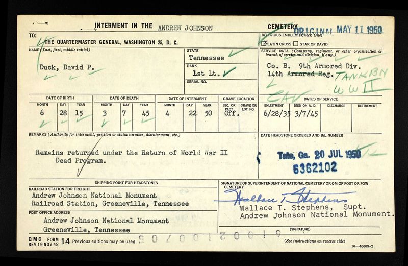 - Burial/Memorial Location: Andrew Johnson National Cemetery, Greeneville, TN