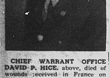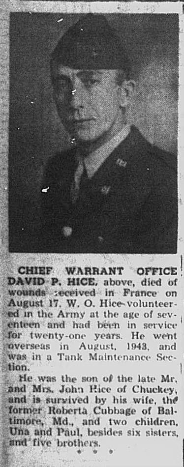 Chief warrant Office David P. Hice, died of wounds received in France on August 17. W.O. Hice volunteered in the Army at the age of seventeen and had been in service for twenty-one years. He went overseas in August, 1943, and was in a Tank Maintenance Section.