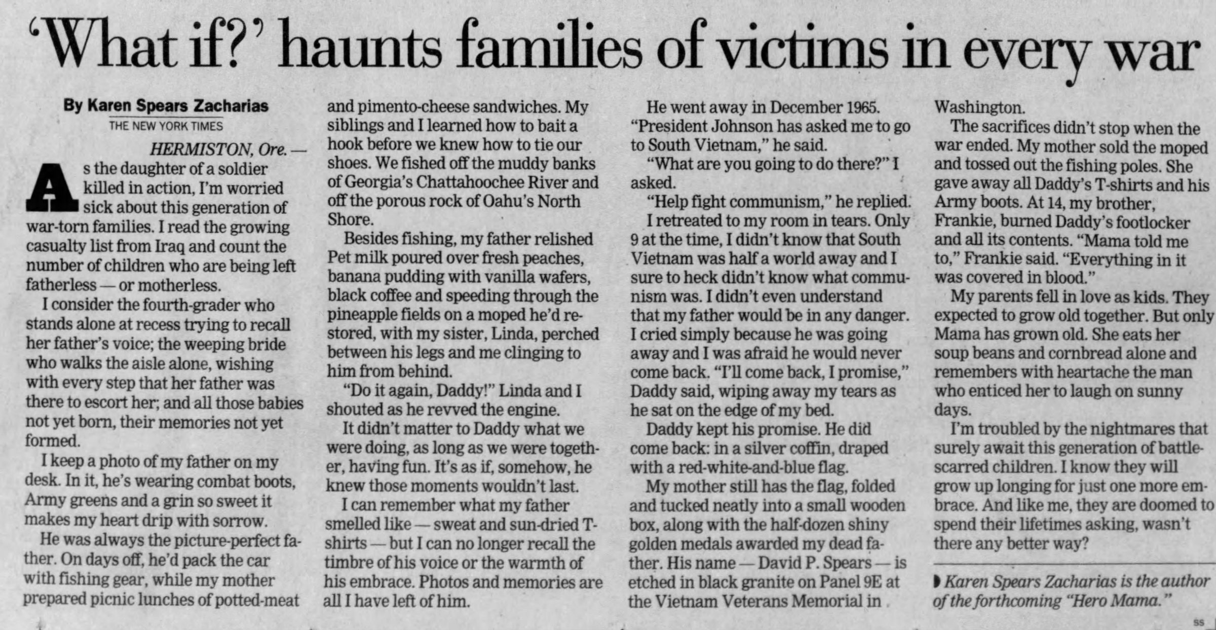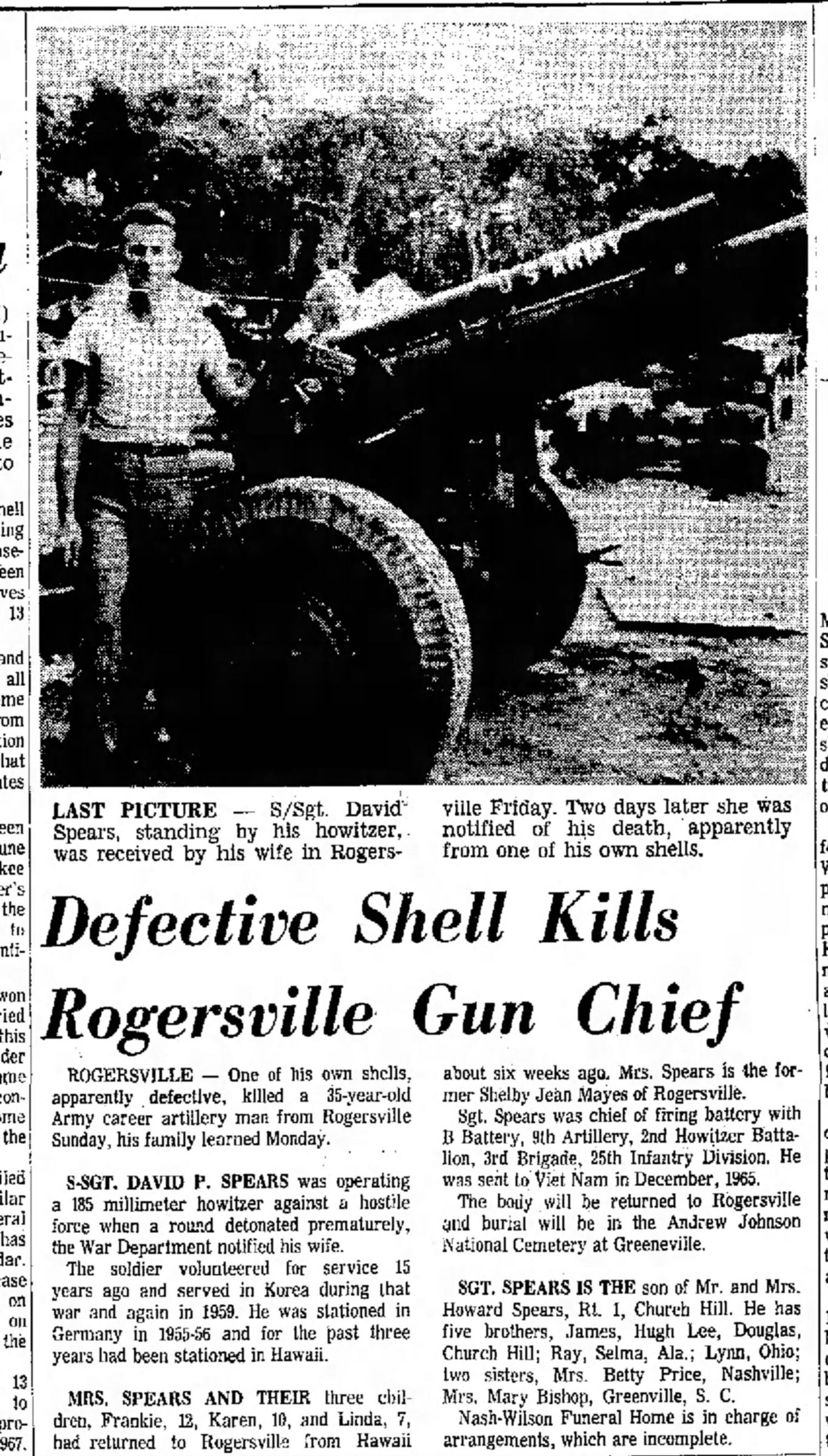 David Paul Spears was operating a 185 millimeter howitzer against a hostile force when a round detonated prematurely. He volunteered for service 15 years ago and served in Korea during that war and again in 1959. He was stationed in Germany in 1955-1956 and for the past three years had been stationed in Hawaii. S/Sgt Spears was married to the former Shelby Jean Mayes of Rogersville and father of three children, Frankie, Karen and Linda.