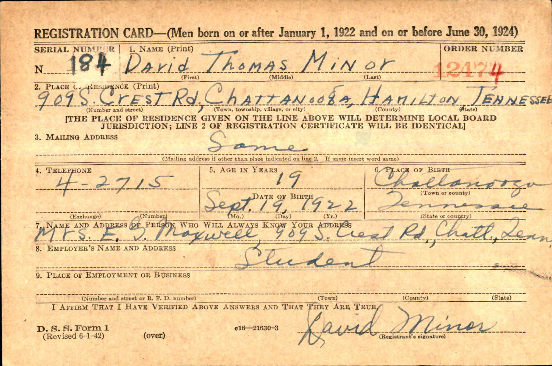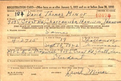 David Thomas Minor was born at Chattanooga, Tennessee, the son of Otto Bernard Minor and Loretta Thomas. Brother of Emily Jean Minor. Stepson of Emory Gilmore Maxwell. He attended Central High School.