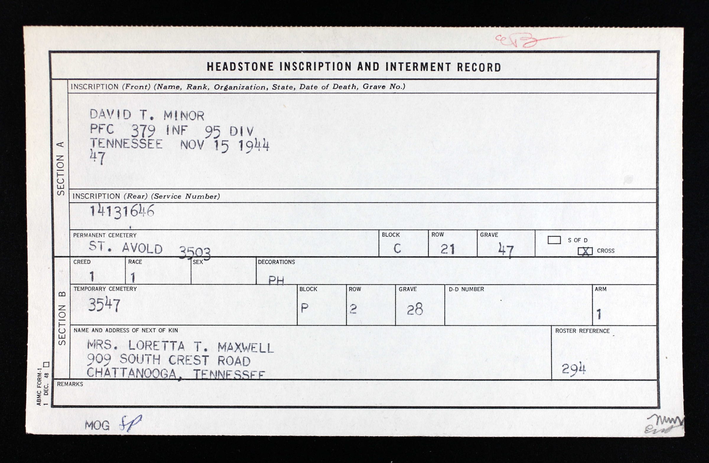 Killed in action was Pfc. David T. Minor, 22, son of Mrs. E. G. Maxwell, 909 South Crest Road, and the late Otto B. Minor. Pfc. Minor was reported killed in action Nov. 15, while on dut with an infantry group in France, the War Department informed his mother. A former student at the University of Tennessee before entering the army two years ago, he was a graduate of Central High School and an active member of the Centenary Methodist Church and-H Club. He was the brother of Mrs. Harry Achey of Chattanooga.