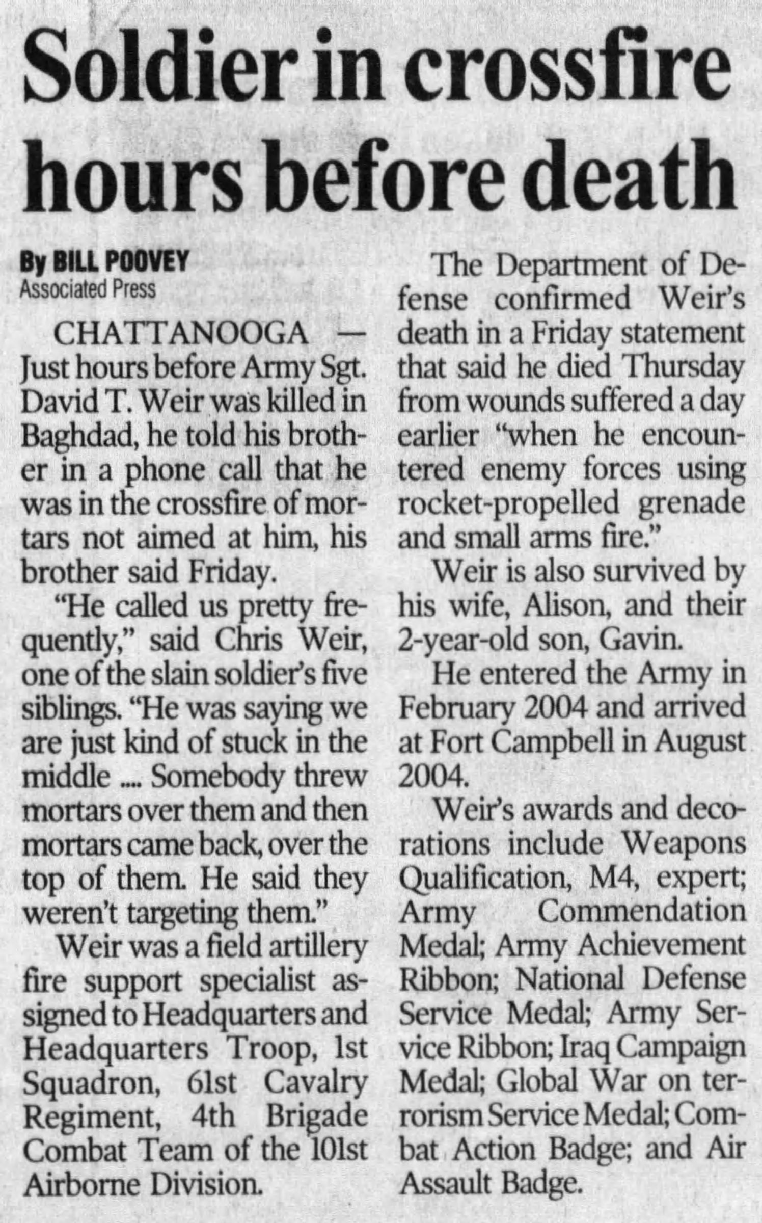 David Weir had just re-enlisted and his promotion to sergeant had been scheduled to take effect October 1 but the Army awarded the rank posthumously. Weir entered the Army in February of 2004. He was a member of the 101st Airborne Division stationed at Fort Campbell, Kentucky.