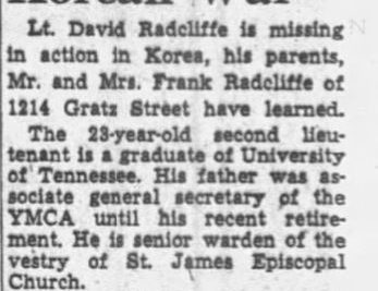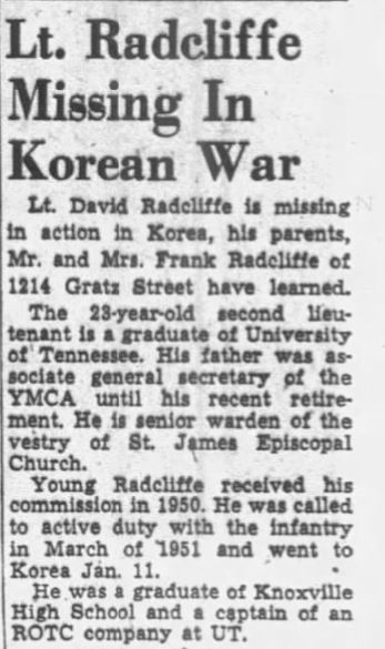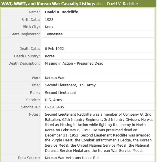 Second Lieutenant Radcliffe was a member of Company G, 2nd Battalion, 65th Infantry Regiment, 3rd Infantry Division. He was listed as Missing in Action while fighting the enemy in North Korea on February 6, 1952. He was presumed dead on December 31, 1953. His remains were not recovered. His name is inscribed on the Courts of the Missing at the Honolulu Memorial.