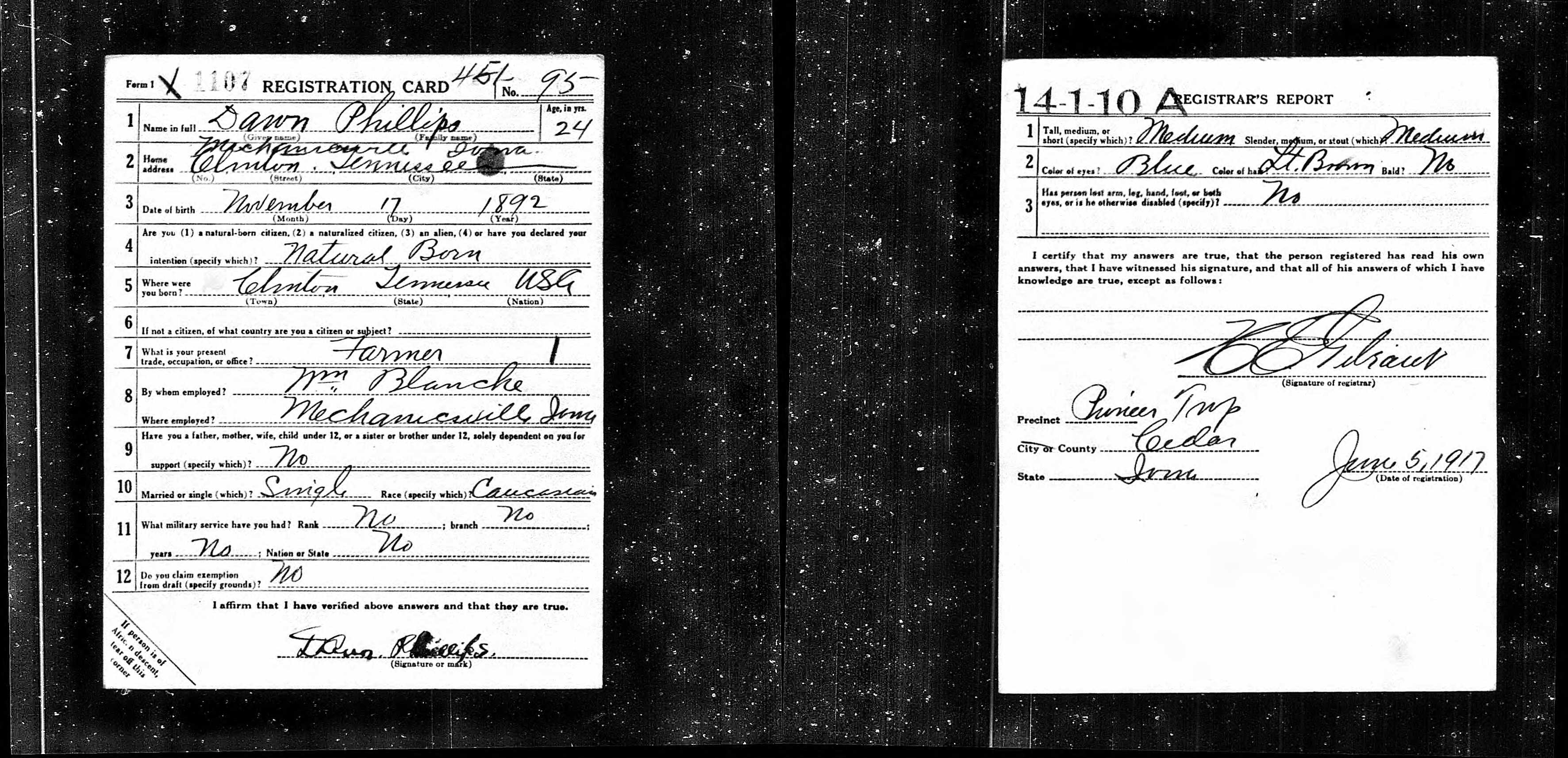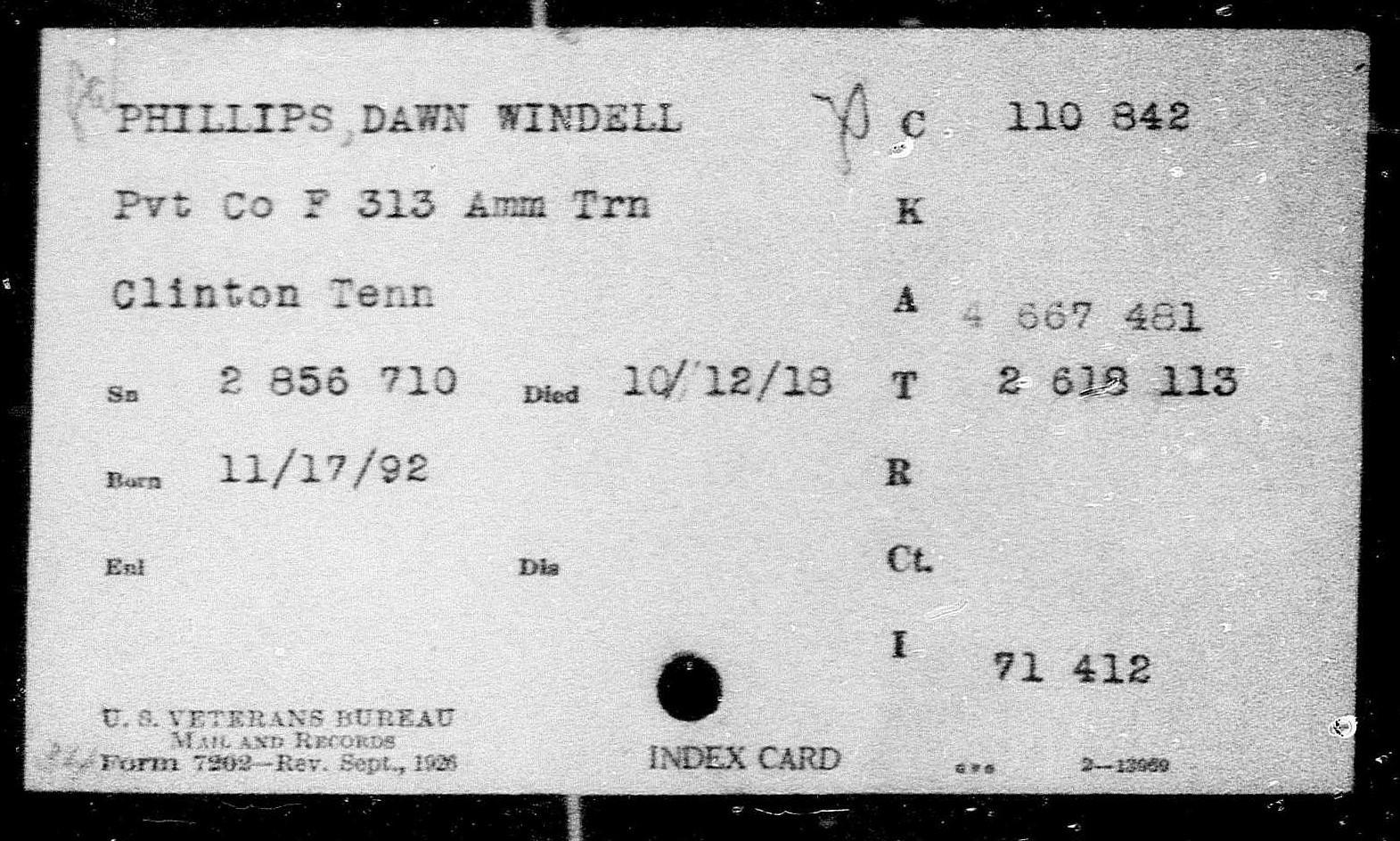 Private Dawn Windell Phillips was born on November 17, 1892 in Clinton, Tennessee. Prior to serving in the military, he lived and worked in Mechanicsville, Iowa. He was employed as a farm laborer by William Blanche. During his service in World War I, Private Phillips served in Company F, 313th Infantry Regiment. He died of disease in Hericourt, France on October 13, 1918. He is buried at Bethel Baptist Cemetery in Norris, Tennessee.