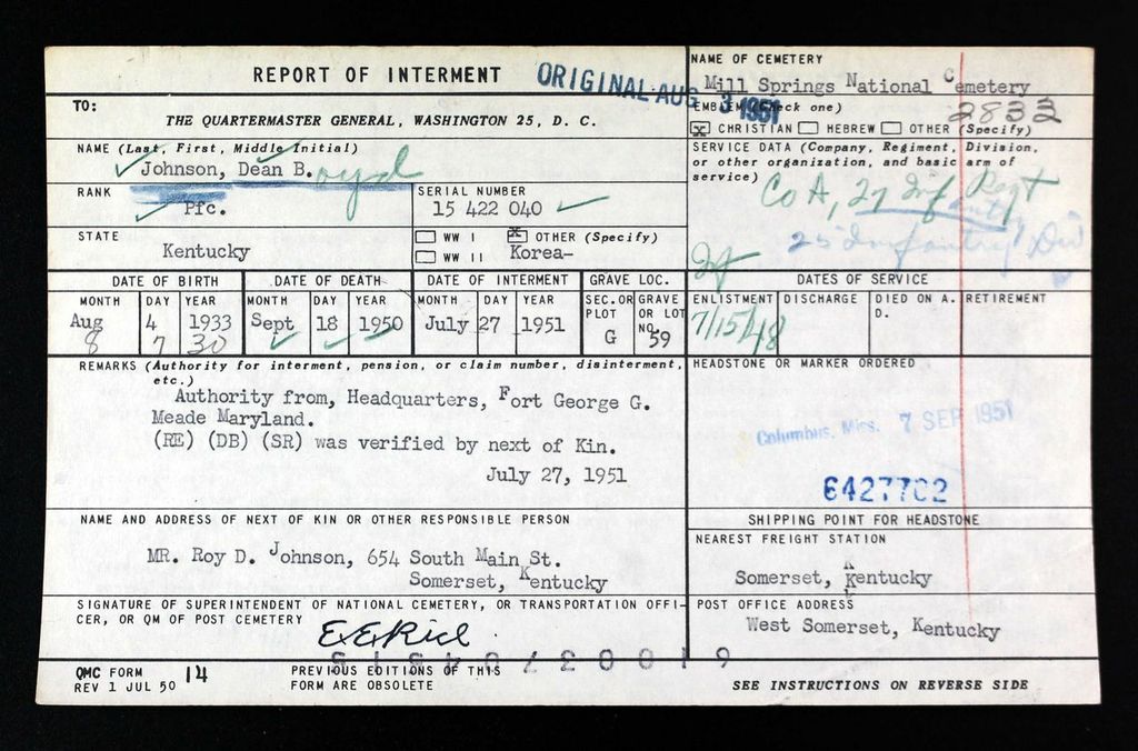 Private First Class Johnson was a member of the 27th Infantry Regiment, 25th Infantry Division. He was seriously wounded by the enemy in South Korea on September 18, 1950 and died of those wounds later that day.