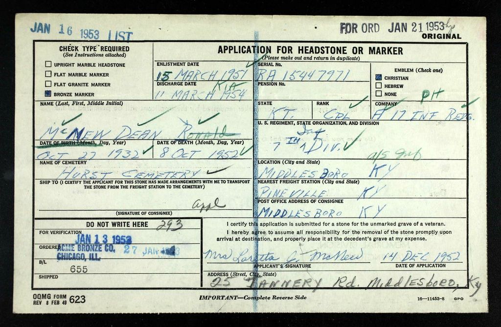 Corporal McNew was a member of the 17th Infantry Regiment, 7th Infantry Division. He was Killed in Action while fighting the enemy in North Korea.