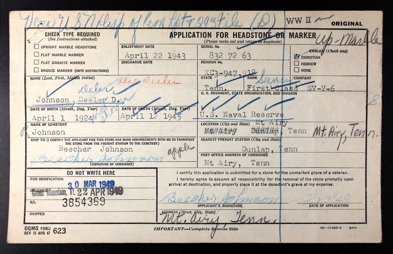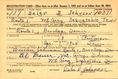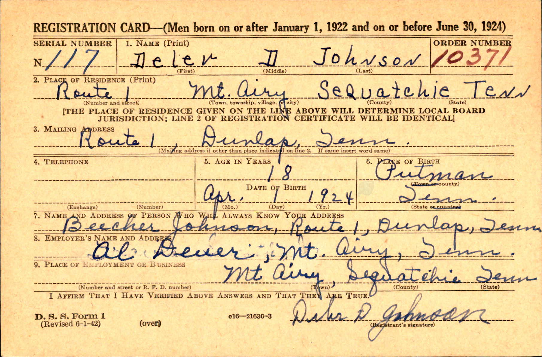 Deler (also Deeler) D. Johnson was born on 1 April 1924, the son of Beecher Henry Johnson and Cora A McCloud.