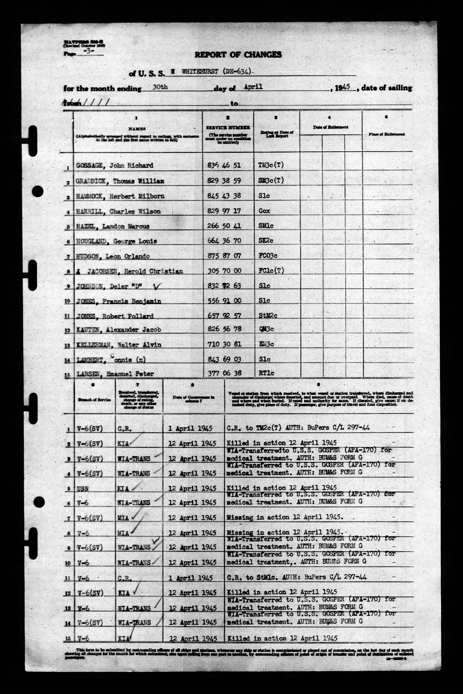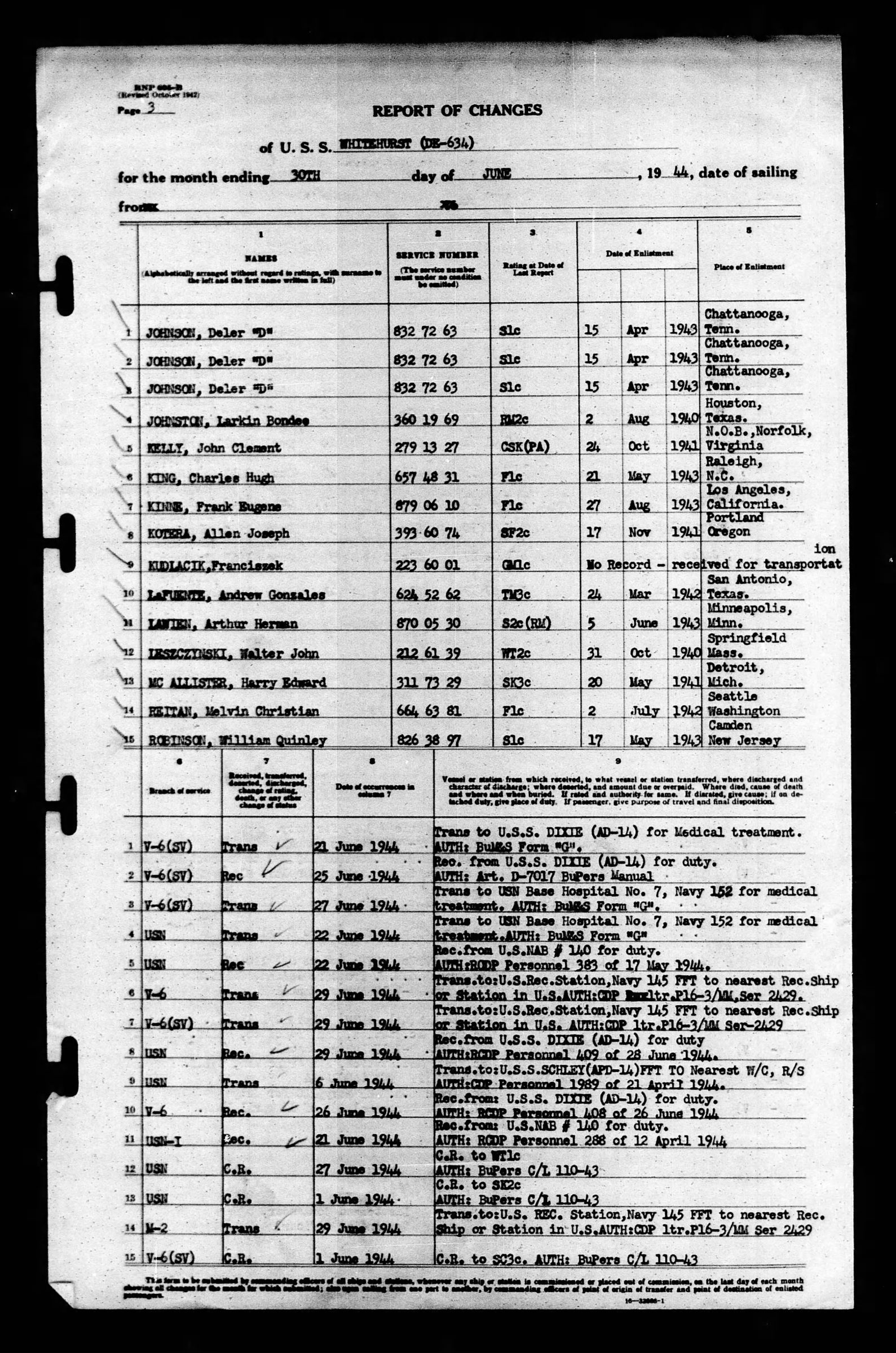 Deler Johnson served on the U.S.S. Whitehurst (DE-634)