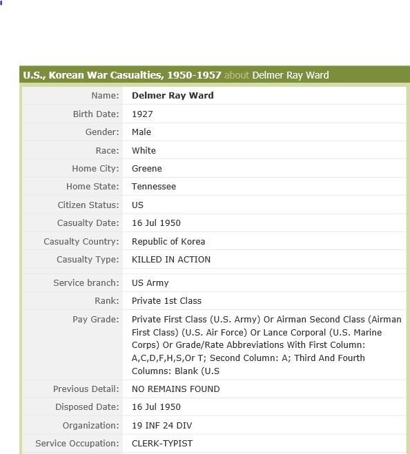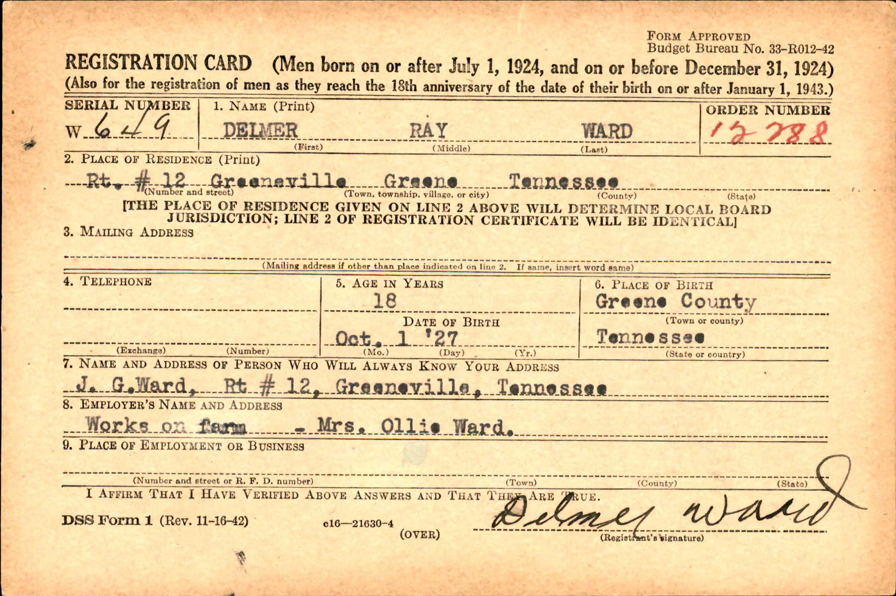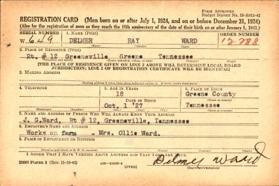 Delmer Ray Ward was born in Baileyton, Greene County, Tennessee to James Garfield Ward and Ollie Elizabeth Ryan.