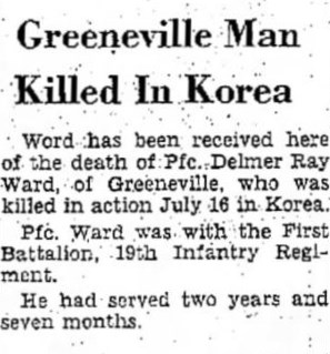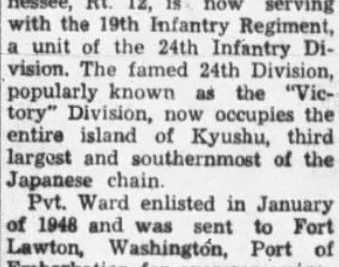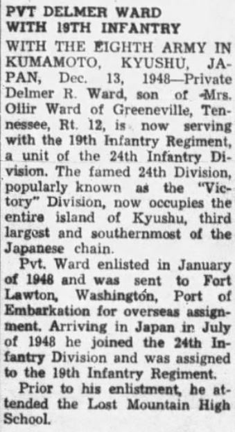 Private Delmer R. Ward, son of Mrs. Ollie Ward of Greeneville, Tennessee, Rt. 12 is now serving with the 19th Infantry Regiment, a unit of the 24th Infantry Division. The famed 24th Division, popularly known as the “Victory” Division, now occupies the entire island of Kyushu, third largest and southernmost of the Japanese chain. Pvt. Ward enlisted in January of 1948 and was sent to Fort Lawton, Washington, Port of Embarkation for overseas assignment. Arriving in Japan in Juy of 1948 he joined the 24th Infantry Division and was assigned to the 19th Infantry Regiment. Prior to his enlistment, he attended Lost Mountain High School.